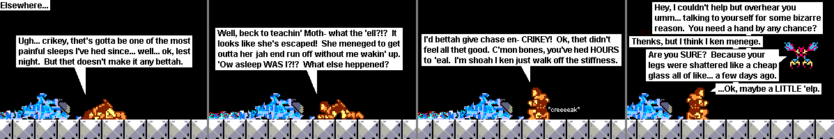 I'd better give chase an- CRIKEY! Ok, that didn't feel good at all. C'mon bones, you've had HOURS to heal. I'm sure I can just walk off the stiffness.