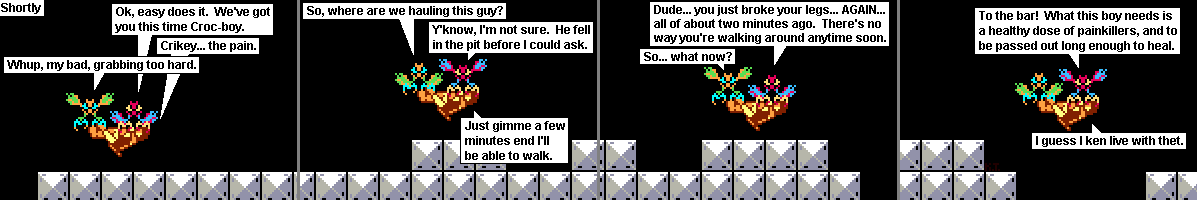 Dude... you just broke your legs... AGAIN... all of about two minutes ago. There's no way you're walking around anytime soon.