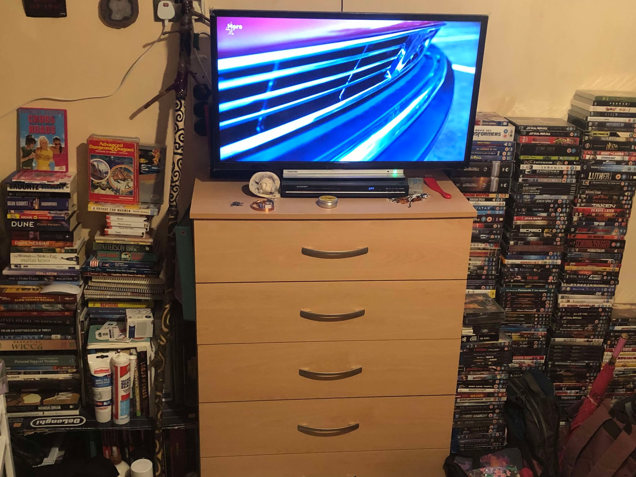 It's a bit of a cramped space, but it's there, and it's a start! I also sprited our TV area, with all of the books and DVD's to fill out the sprite-room. Let's just say the work table is offscree-it's a cramped room, we can only fit so much lol. Anyways, progress!!!