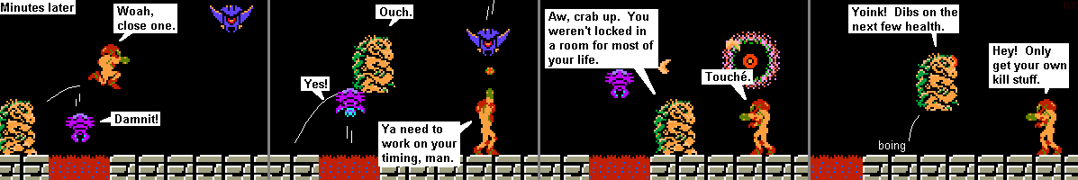 Yeah... this strip is basically just kinda leading into the next strip. Although, we see in this strip that Samus is a greedy little thing. And this particular strip basically portrays my feeling in any online games (or MUDs... such as Fallout mud... see links section). If you get a kill, it's your stuff. Only should it be up for grabs when you leave the screen/direct kill area.