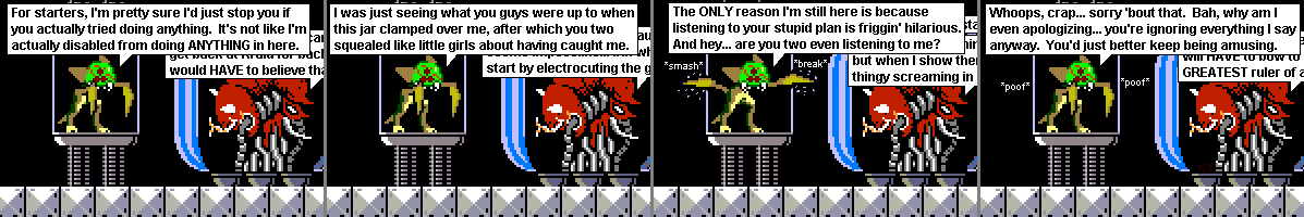 Metroid, Samus, Kraid, and the rest of 'em are all property of Nintendo, who to my knowledge wouldn't do anything such as sue me or shut poor Planet Zebeth down, because they're so damn nice, and Metroid kicks ass : }