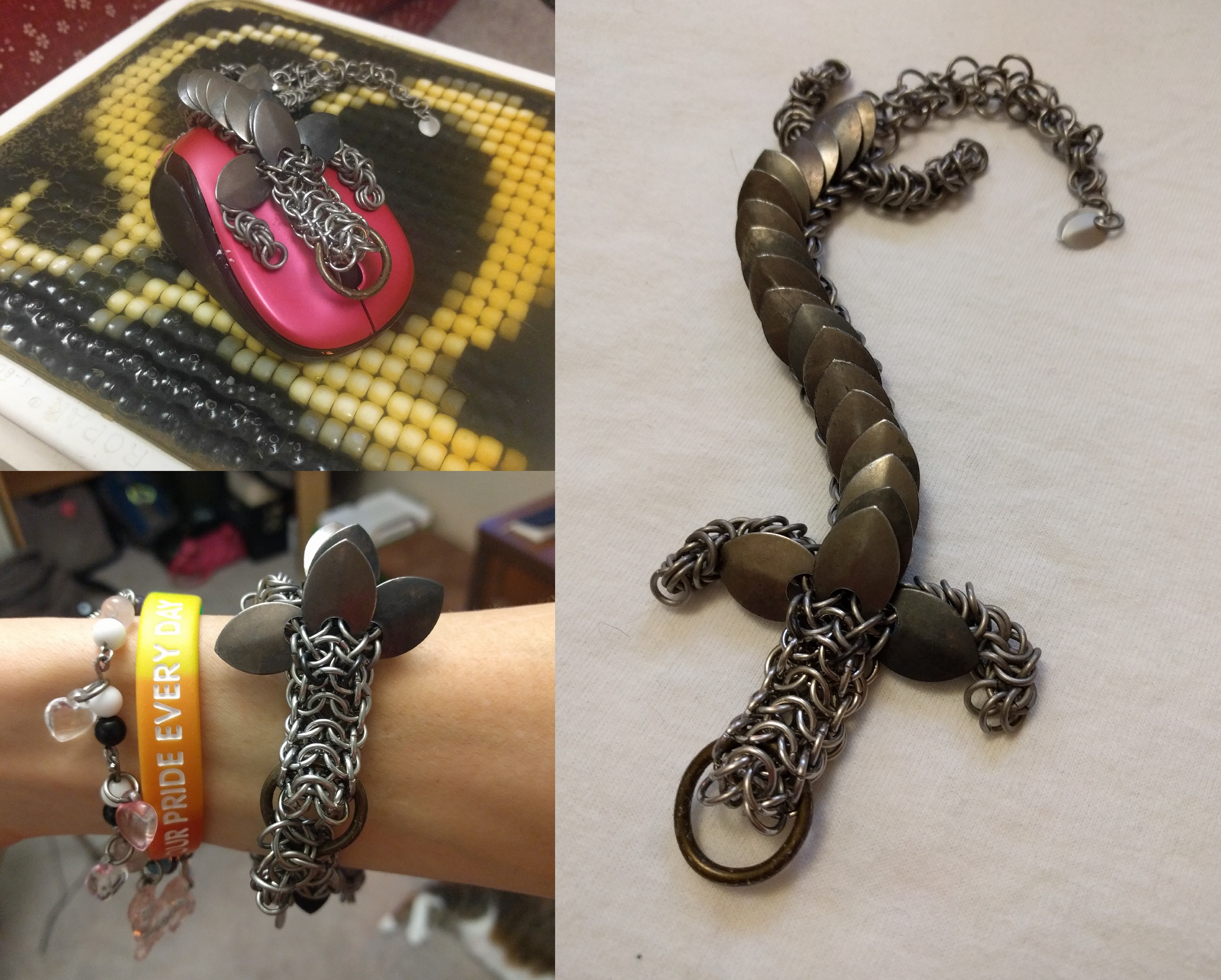 | Venus - February 2017 This was a really fun project, done while livestreaming. Made from a mixture of ring sizes, though all 18 gauge. The head is 7/32"ID stainless steel in alienmaille weave, the body is 1/4"ID titanium in persian dragonscale, the legs are 3/16"ID titanium in roundmaille and byzantine, and the tail is 1/4"ID titanium in elfweave, which tapers down to a pair of aluminum scales. The back scales are tempered high-carbon steel, which have a beautifully weatherworn look to them. There's a handful of other assorted sizes as needed too (including a handmade mouth ring of 12 gauge 11/16"ID enamelled steel coathanger wire, for lack of an available alternative), so she's got a mix of a little of everything in her :) The tail can be threaded through the mouth ring and connected a clasp beneath the last back scale and worn as a bracelet :D A gift to my bestie's daughter Zöe ❤ |