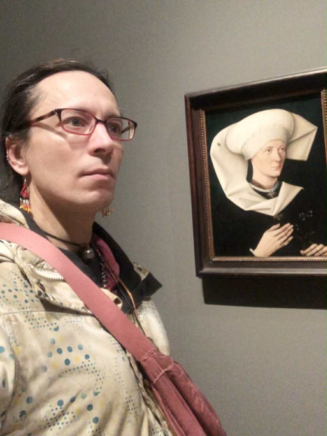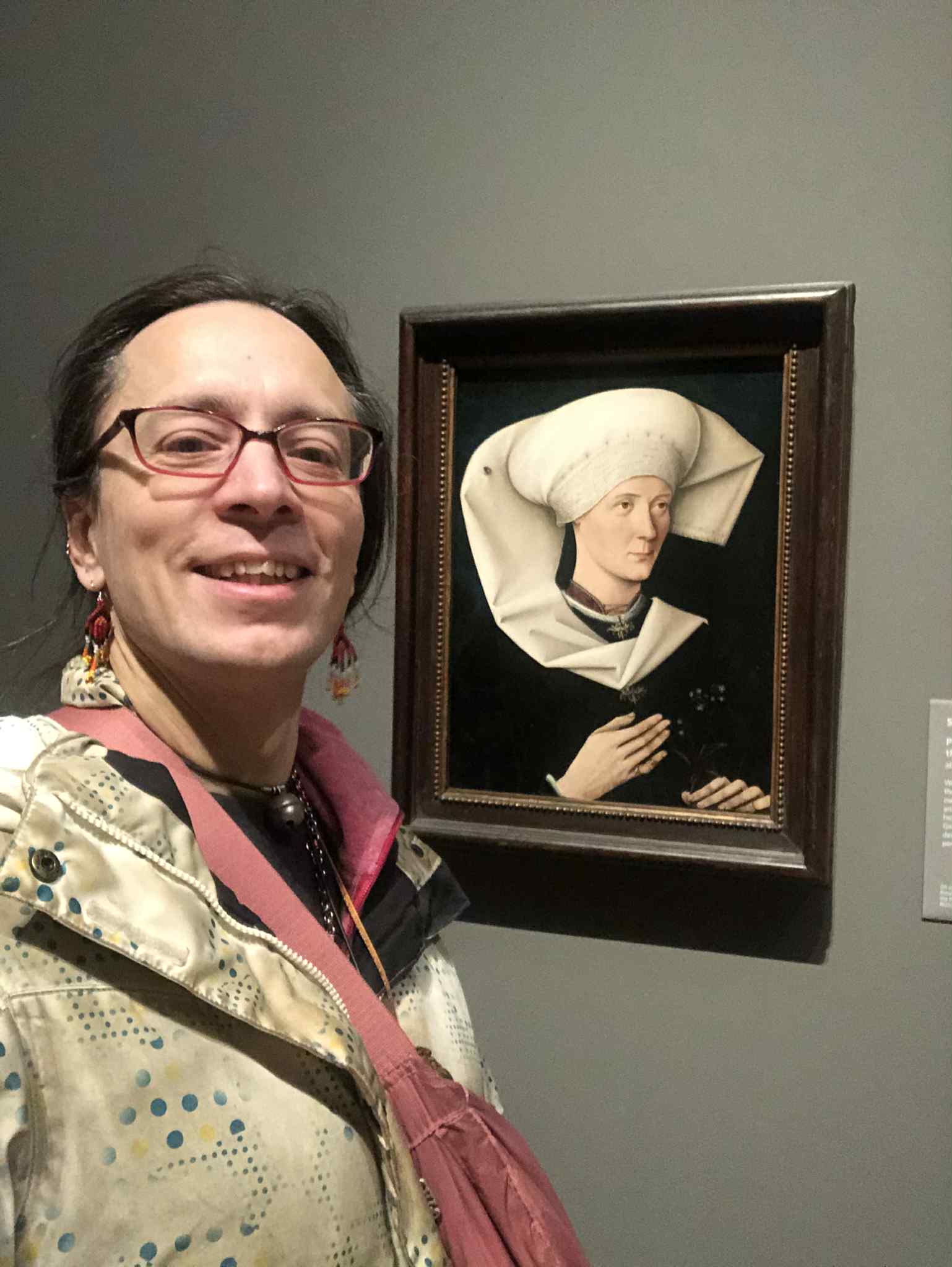 Kabutroid smiling and standing beside the actual painting of Portrait of a Woman of the Hofer Family and smiling, while wearing a speckled white winter jacket.Kabutroid mimicking the expression of the Hofer woman's face while standing beside the painting.