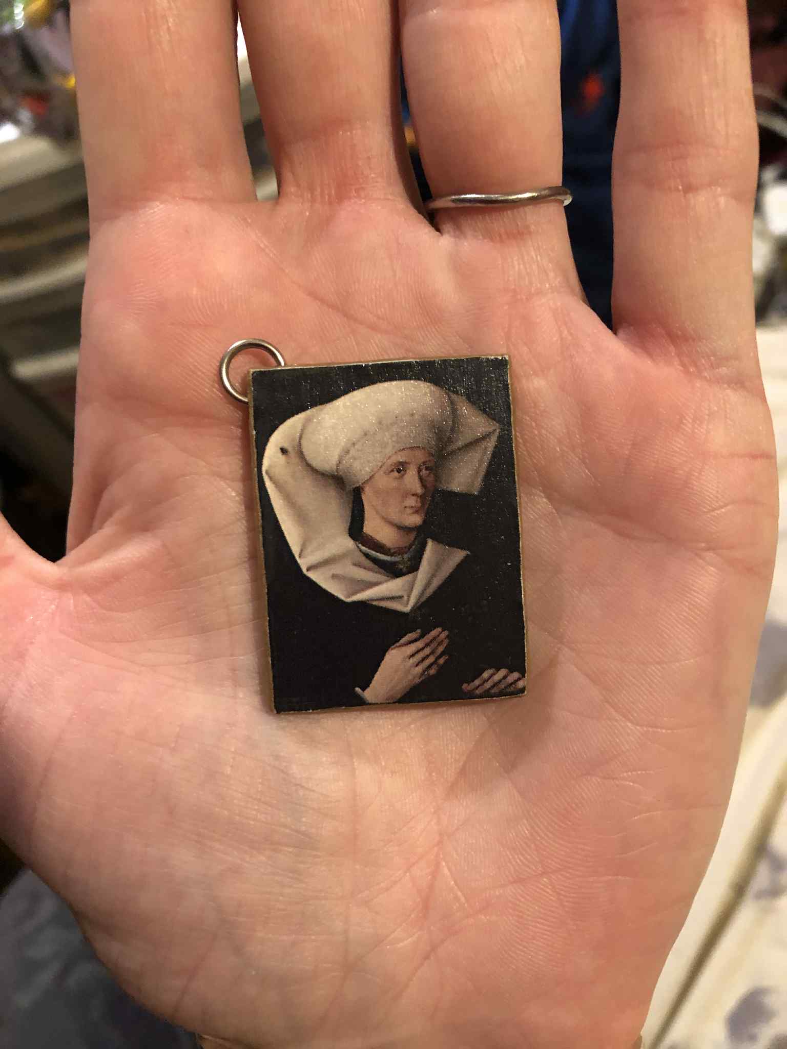 So we decided to print out a wee lil version (and soon several) of the Portrait of a Woman of the Hofer Family. Yah I know I'm enamored with this painting lol. It started out with just making a little palm-sized one to hang on the wall, with the idea/concept still fresh in my mind from the Team Sky emblem. And then after that, I decided to make a whole pile of photo ornaments, and thought... eh, I want one of these mini-paintings for the wall, let's make one more for the tree, and one liiittle tiny one to extra-strong-topcoat (that was actually made at the same time as the main one, as a test to see if the varnish would mess with the printout) to have on my keys. An so it was.