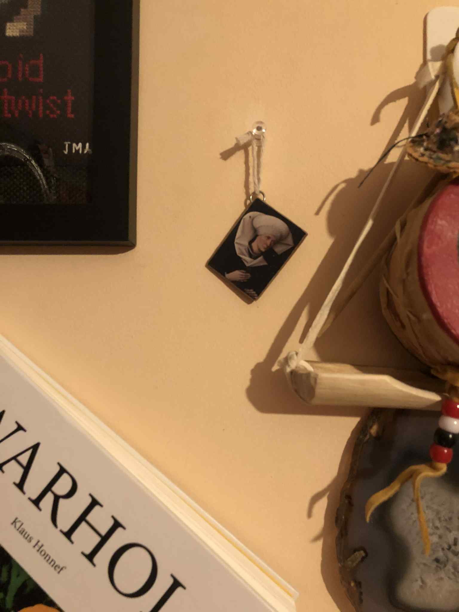 The miniature painting laying in Kabutroid's palm, about one and a half inches by two inches in size, with a small metal ring going through the top left corner, but through the depth of the material so that there is no hole in the painting itself. The mini painting hanging from a thumbtack in the wall, bear the Planet Zebeth cross stitch, some indigenous memorabilia, and the Andy Warhol art book. Three different sized keychain-type versions of the Hofer painting, ranging from about 3 centimeters tall to about 1.5 centimeters tall, each with a metal ring depthwise through one corner. The largest one has a cotton string through it to hang on the wall.