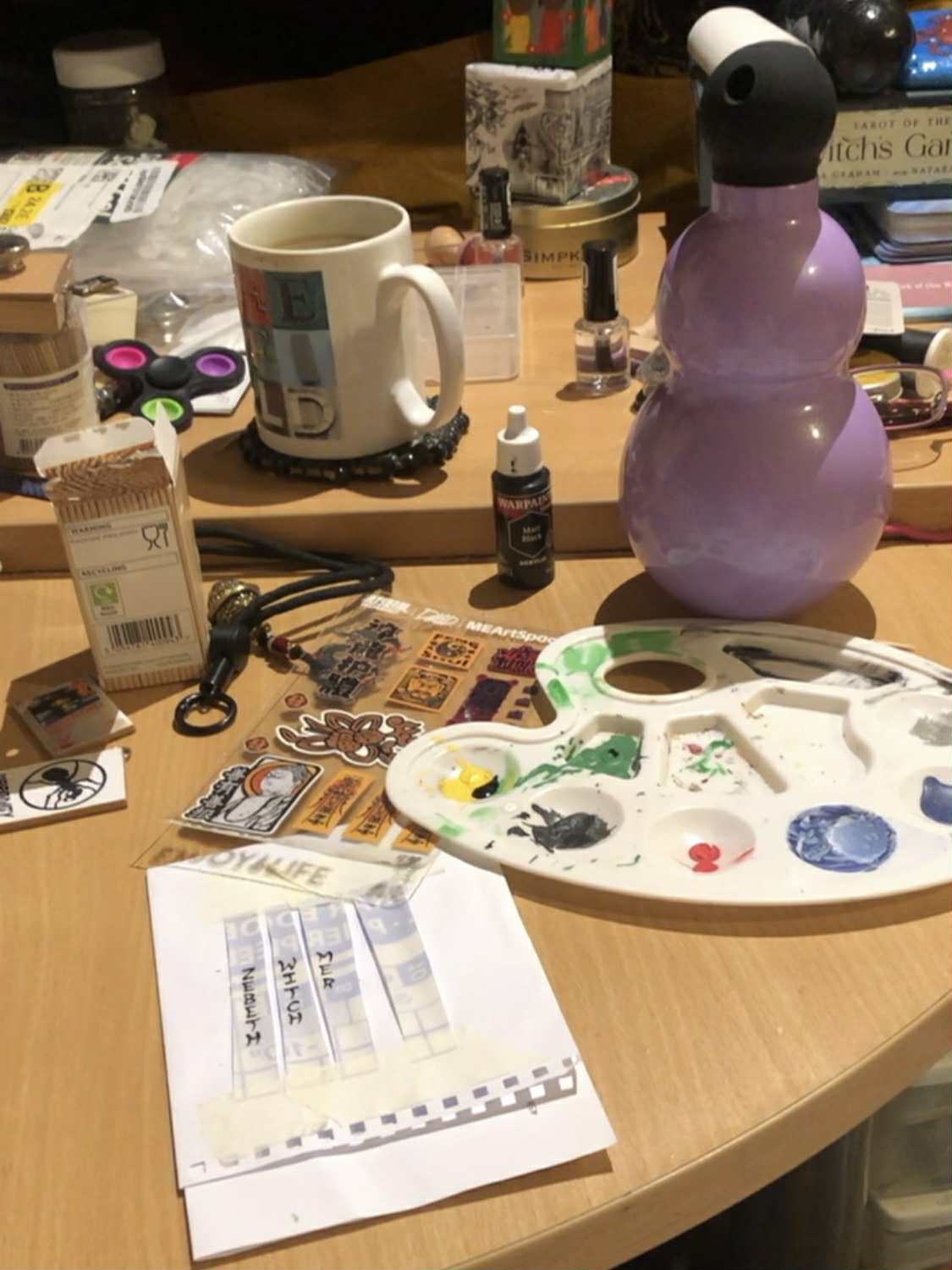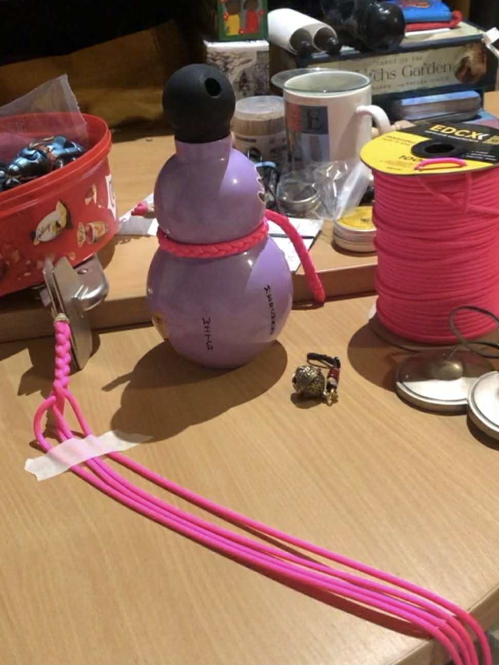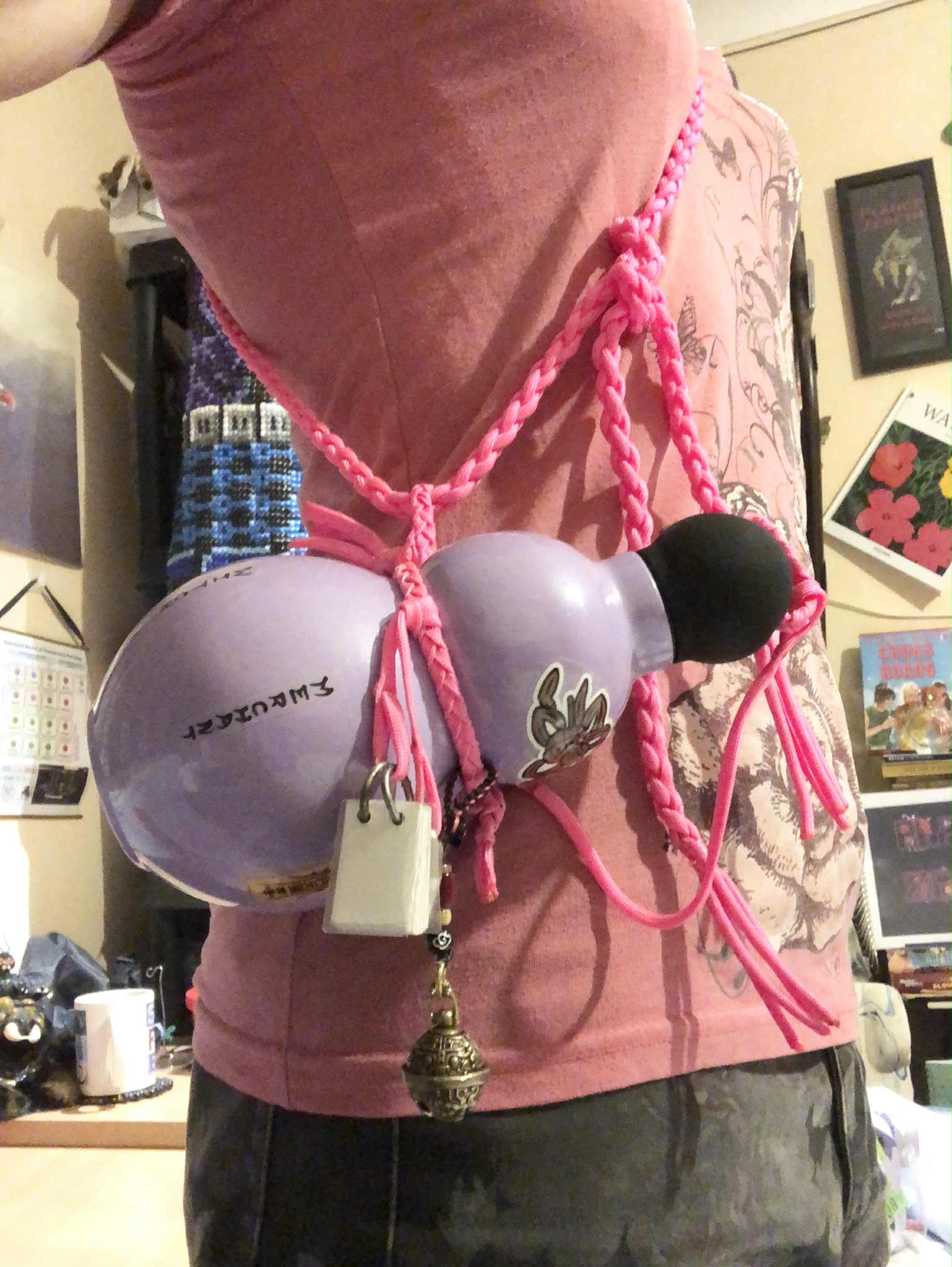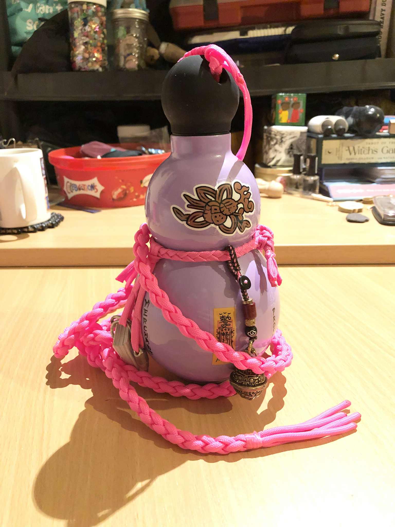 And then this showed up. Just days before my birthday, my social media feeds were swamped with ads for this gourd bottle by Enjoy Gourd (Enjoy-Gourd). And it's like... it's kismet, it's meant to be. This was to be my birthday present to myself. And so, looking around the site, I went with the thermos-style bottle for hot-drink carrying, and a threaded top for fall protection. And it was on sale for black friday, so ayyyy, added bonus! And so taking in the available colours, we went with lavender, and waited... It didn't take long, and it's everything I dreamed! No, it's not natural gourd, but this won't crack, is threaded capped, and will last for ages! And, on testing, keeps tea piping hot for 12 hours plus! But it needed to be decorated. The photos online had so many different decorative styles shown, I needed to personalise mine. Stickers! It came with a big sheet of stickers, which I had debated which to affix to the bottle. What won out was the three yellow banners that, as best Meta AI can translate, say "zǐ wēi dà dì shén xíng yuán yáng fú", meaning "Talisman of the Supreme Emperor of the Purple Star, Divine Action of Primordial Yang", a Taoist protective talisman for spiritual protection and energy balance. Given I'm a witch (also one of the english words on the bottle) and The Eagle who Flies through the Heaven, that works out perfectly. It also gives me 3 vertical texts to compliment with english words, choosing Zebeth, Witch, Merchant, and Prosper, to make for a lucky 7 words. On the top, I put the large gourd knot sticker, which compliments the bottom well. And then we needed straps, as I wanted something other than the regular black cording. Pink paracord to compliment! We removed the core from some of the paracord to make a flat braid to tightly wrap around the center of the gourd, the same to go through the cap, and a single strand to loosely connect them (being well loose enough to unscrew the lid). Attaching the "bell of cloudy sonance", which I ordered as well, I added a few strands of that pink paracord through the strap for that, strengthened the bottom-most ring connecting the bell with the 11 pound fishing line, and attached that more or less permanently to the central strap. I also added a connecting loop to tie the shoulder strap through, a four strand full paracord round braid, which matched in size nicely to the original shoulder strap. And it chimes with such a wonderful little chime, to go well with my merchant bell. But I wasn't done yet. I had one other vision in my mind for it... SEVERAL things hanging from the gourd! The nerd in me saw a teeeensy little pen, and tiny little waterproof notepad to go with it. And so we ordered a Forever Pen (WorldsTiniest), and set about making a tiny little notepad similar to the Rosary book. But, since I only want the bell to be making sound, I put some heatshrink tubing around the pen, as well as the rings of the notepad (which was a bit of a fight but we got it). And with all of the components ready, we finalized the length of the cord (which I also attached with a larks head knot for easy movability to the other side), melt-sealed the ends, and added a few dots of glue under them for one added little bit of security. And with that, completion! The swiss army gourd/utility gourd/chatelaine gourd (ok that last one is a stretch) came out amazing and I am happy. And right before Christmas too, a birthday present finished in time for the holidays Finished December 24, 2025 ![]() |