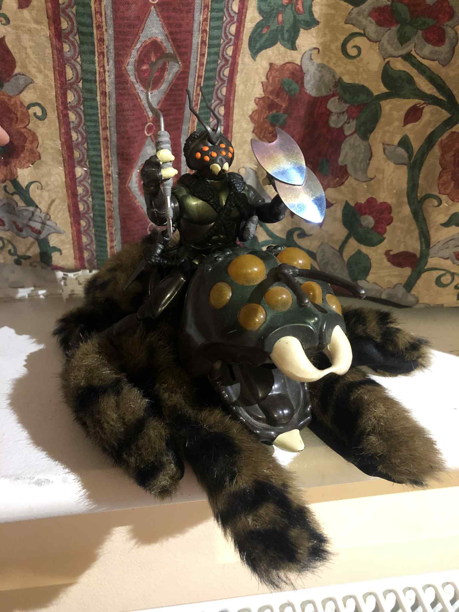 The original original one, as a basically feral child, I of course chewed apart the antennae, the rubbery white teeth, even the saddle. I loved that thing. Now at some point later on, that glove monster living with me through all of my life, I ended up finding a half-broken one at a garage sale and was able to replace the gnarled parts. Also I painted the tongue red, which I didn't end up liking, but oh well. And then that one ended up disappearing somewhere along the line, either lost in a move or whatever, and I bought another one online, with the missing Skulk figure atop (the spider-glove is named Trancula). That one ended up going missing, I think with a box that didn't make it to England. So now, I've bought a third one, third time's the charm! Now, this Skulk didn't come with all of the accessories (the last one at least had the insect wing spear thing). It actually didn't come with any accessories, I ended up doing a second ebay purchase to get two swords (strangely), a spare harness, the box (kinda cool), and more importantly (aside from the swords), the mini comic book! So those are treasured items returned to my collection (the comic you can read here [sectaurs.com]), and I was happy.