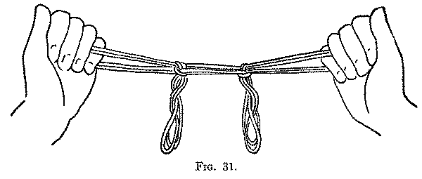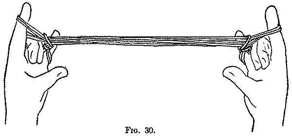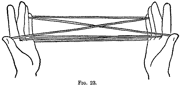 The Fighting Head-Hunters is a good example of that simple type of figure in which most of the movements consist in passing the fingers away from you and toward you, and taking up strings and loops from other fingers of the same hand. The picking up of the strings forming the sides of the central triangle is not a common movement. In the Second movement a loop is transferred from one finger to another and turned over during the transfer. In the Sixth movement we have the first example of an almost universal procedure: When two loops are on a finger the lower loop is lifted over the upper loop and off the finger to form, toward the centre of the figure, a running noose or ring upon the upper loop. If there be three loops on a finger the lower one may be lifted over the upper two, or the lower two over the upper one, but in all cases the principle is the same, namely, to thread the upper loop, which originally belonged to another finger, through the lower loop, which is usually the original loop of the finger. As we shall see further on, this movement is executed in different ways: with the teeth, with the thumb and index of the other hand, by the aid of another finger of the same hand, or merely by twisting the finger itself. It is so general in the Navaho Indian figures that, following Dr. Haddon, in conversation we often speak of it as the "Navaho movement," or, coining a new verb, direct that the loops on a finger shall be "Navahoed."