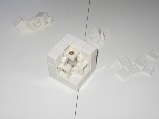 | For those who know me, when I latch onto some random hobby or pasttime, I latch onto it all the way. A random curiosity for wanting a chainmaille shirt for example led to me spending around 200 hours of labour on making it. So it will come as no surprise that when I got into solving a Rubik's Cube, starting first with a 2x2x2 size (see first video above) and then a 3x3x3, I just HAD to get a fancy Cube to customize and build to my specifications. One order from Rubiks.com later, and I had one disassembled, do-it-yourself white-plastic Rubik's Cube, ready for the building. | ![]() |