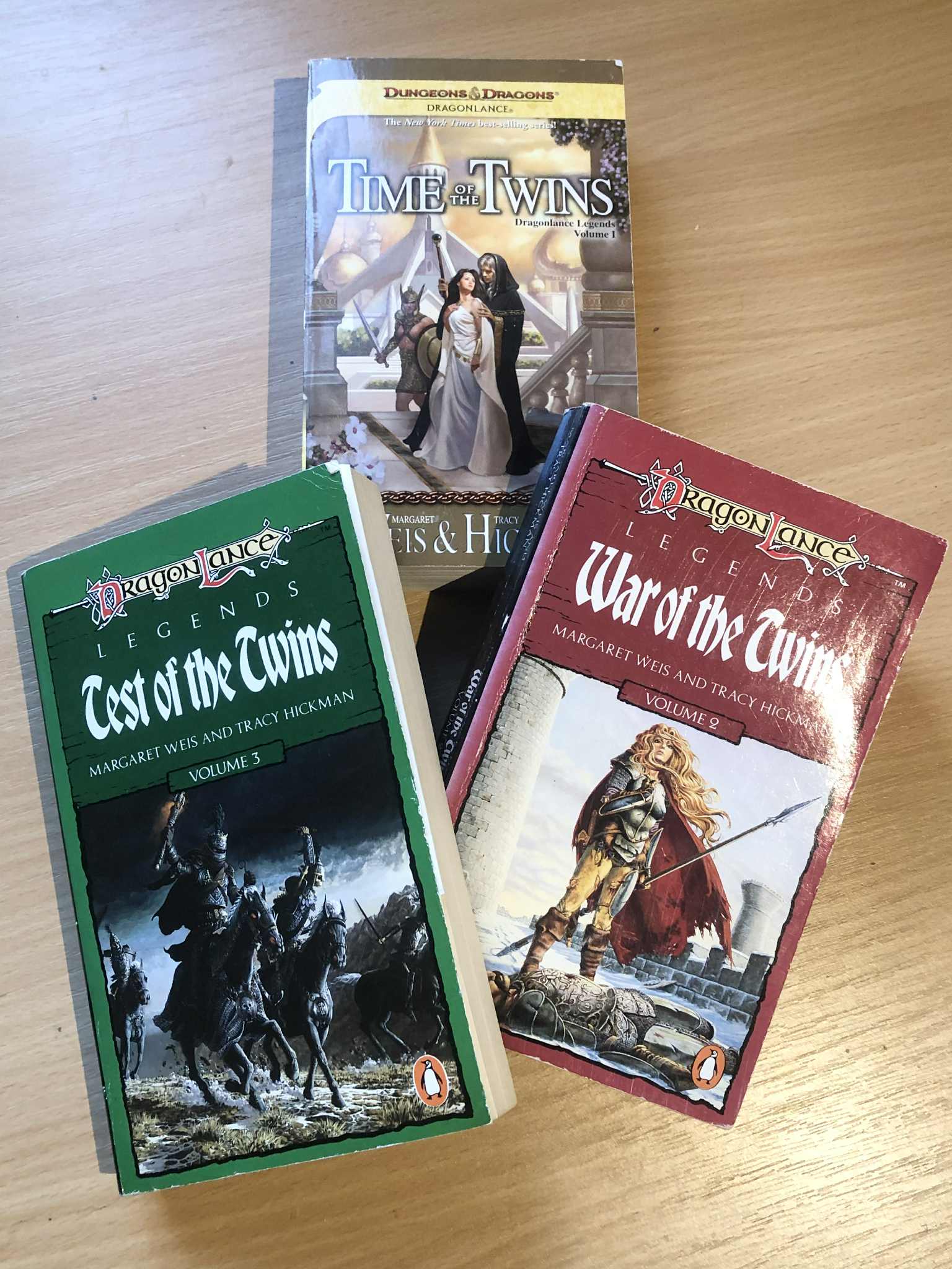 YAAAAS! Birthday part 2, we have the second set of Dragonlance books! As there was no anniversary edition combining the three, and several of them have not been re-released, the latter two were purchased as used, while book 1 was newer, though still having the original cover art. On that note, in this set I get to see all of the cover art, ayyyy! Also, it'll be a lot easier to carry these with me on the train, though once I finish one I'll have to wait until I get home to start the next XD