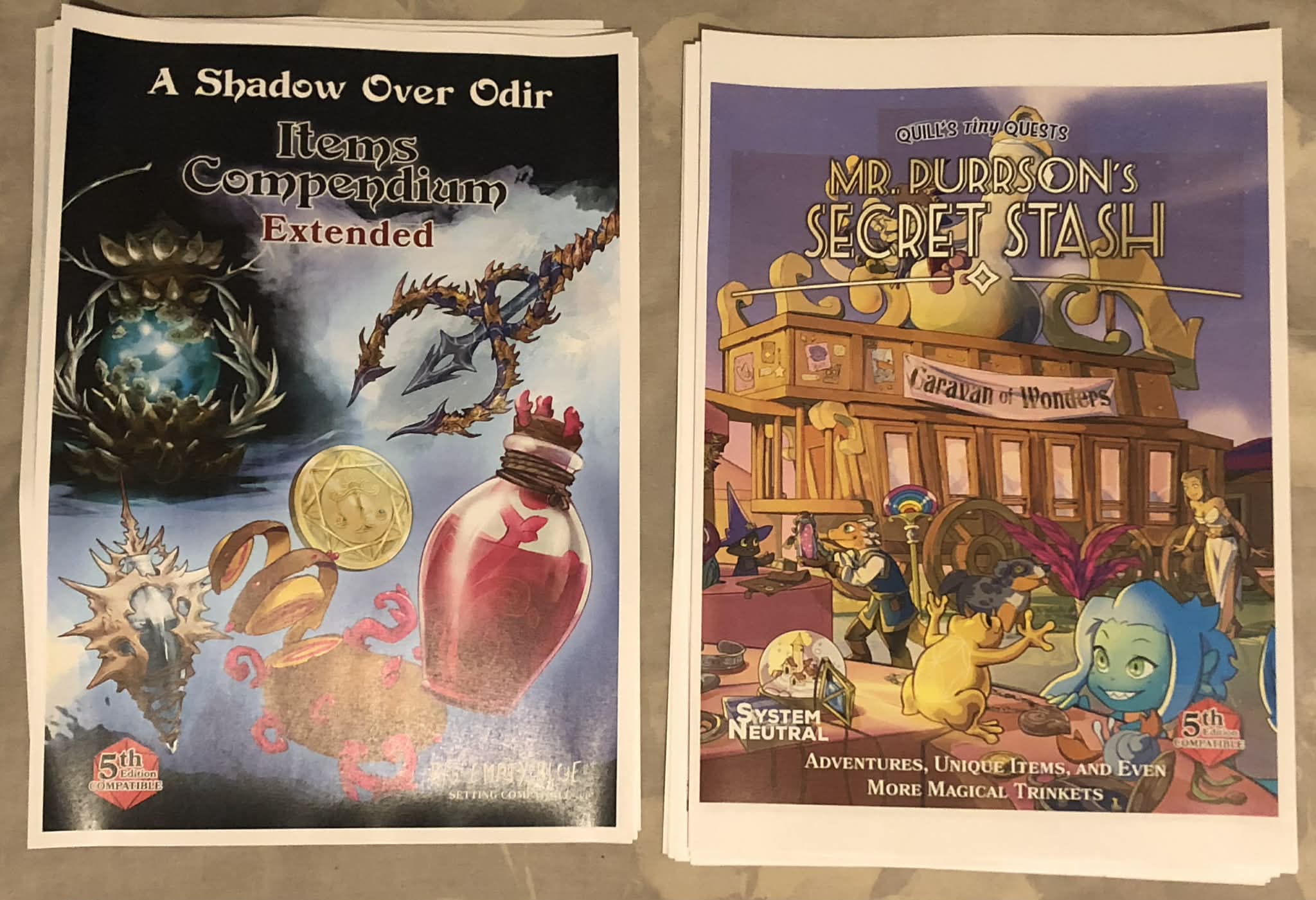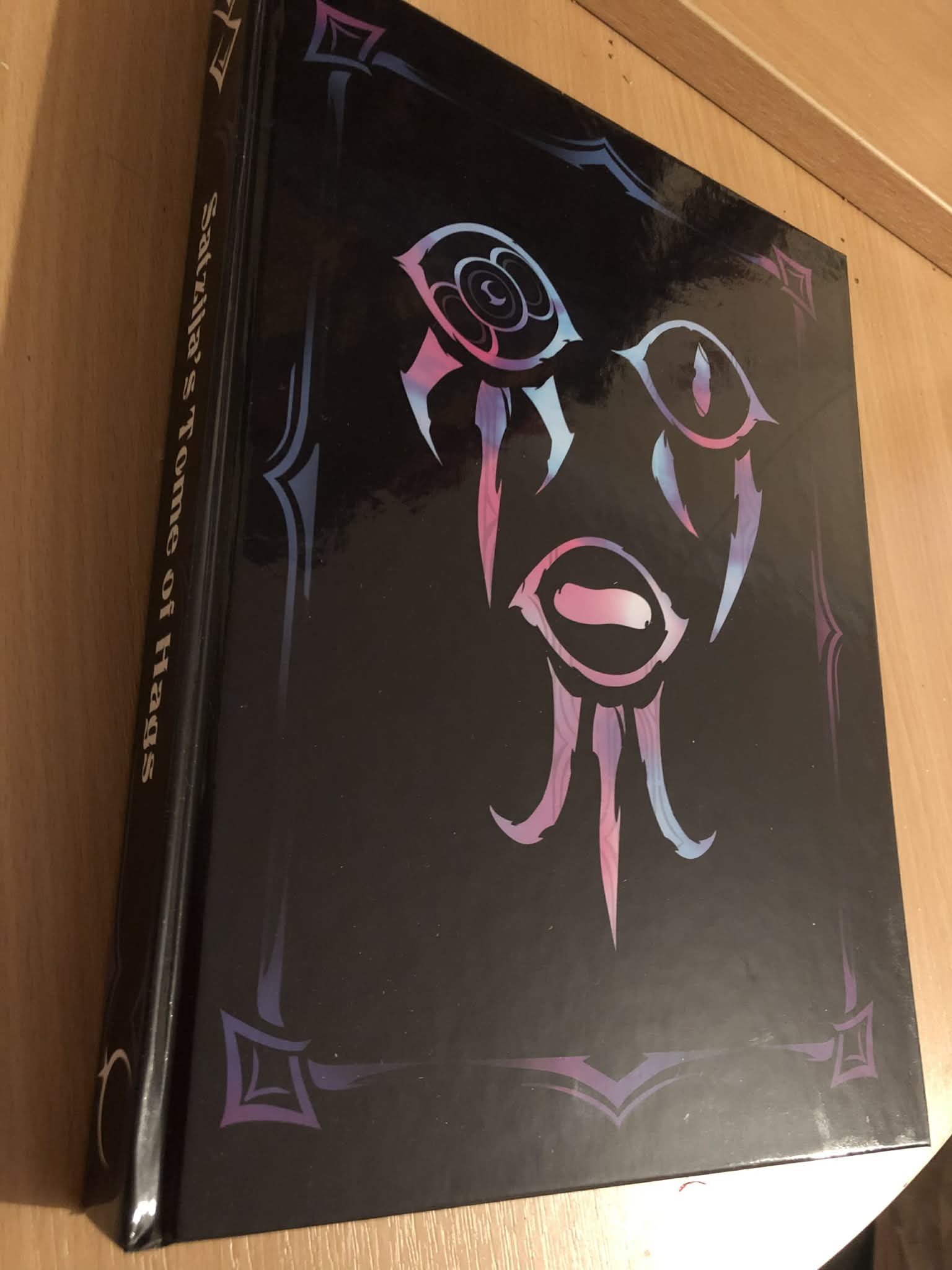 Oh my goodness it has finally arrived! Satzija's Tome of Hags (visible on the spine), a massive compendium of hags, hag covens, friendly hags, hag companions, items, quests, and other fun stuff! I kickstartered this back in November 2024, and even helped in the creation of some of the items and spells, which took place in the Big Empty Blue (bigemptyblue.com) discord server. I got the deluxe hardcover edition (it comes with additional lore and this badass cover), and as well added on the add-ons for Mr. Purrson's Secret Stash and A Shadow Over Odir, which I combined into the single bound companion booklet.