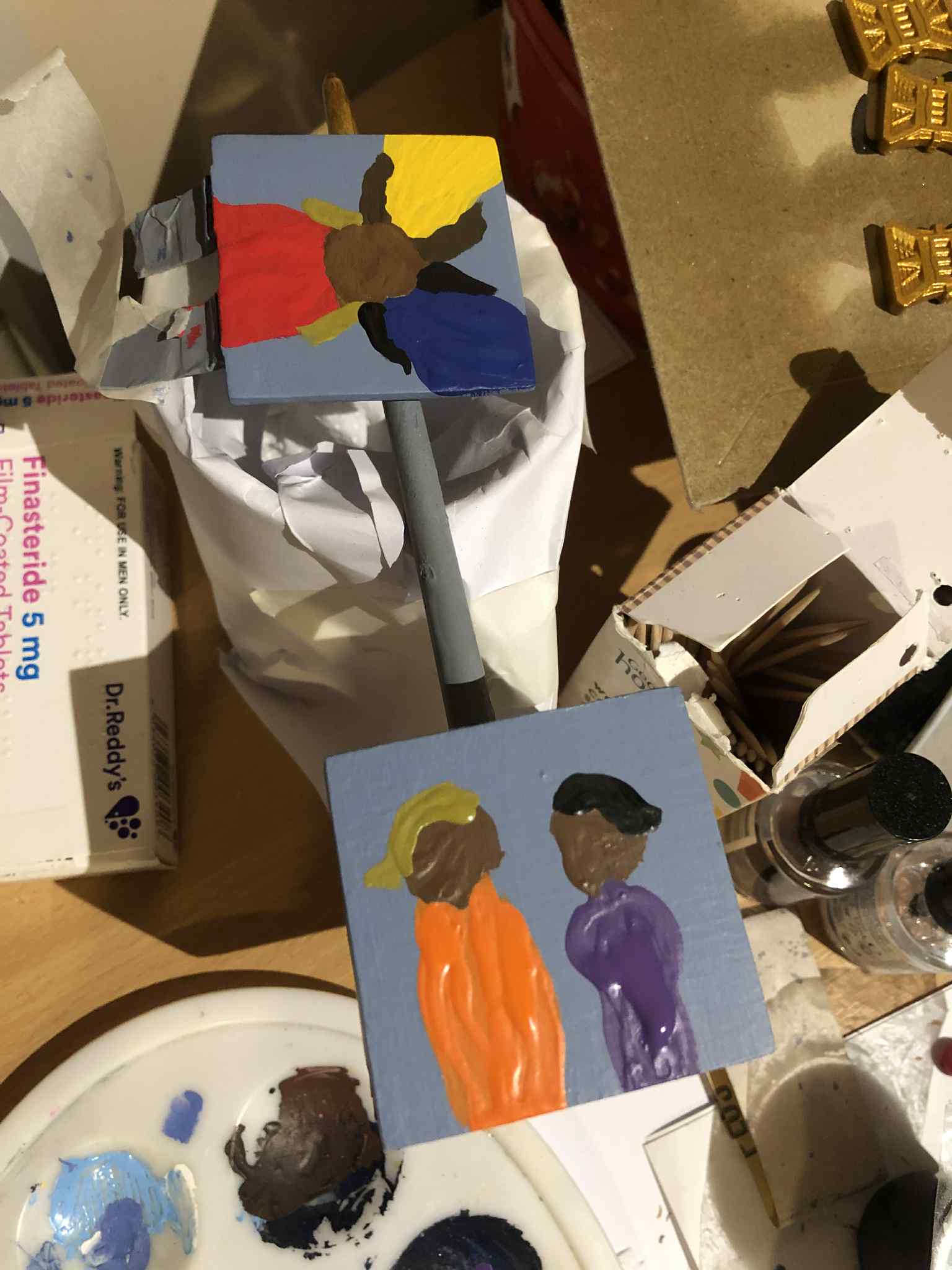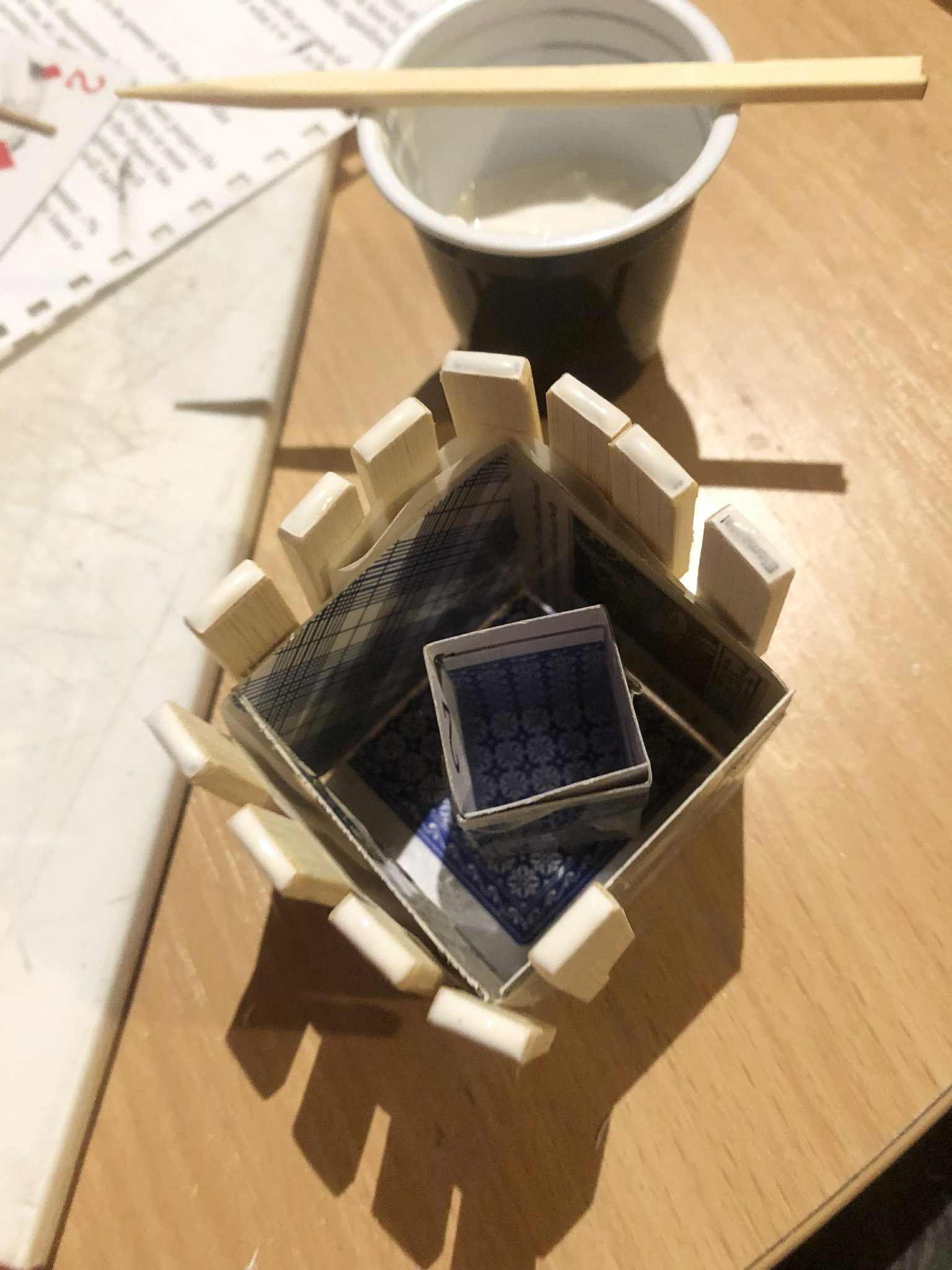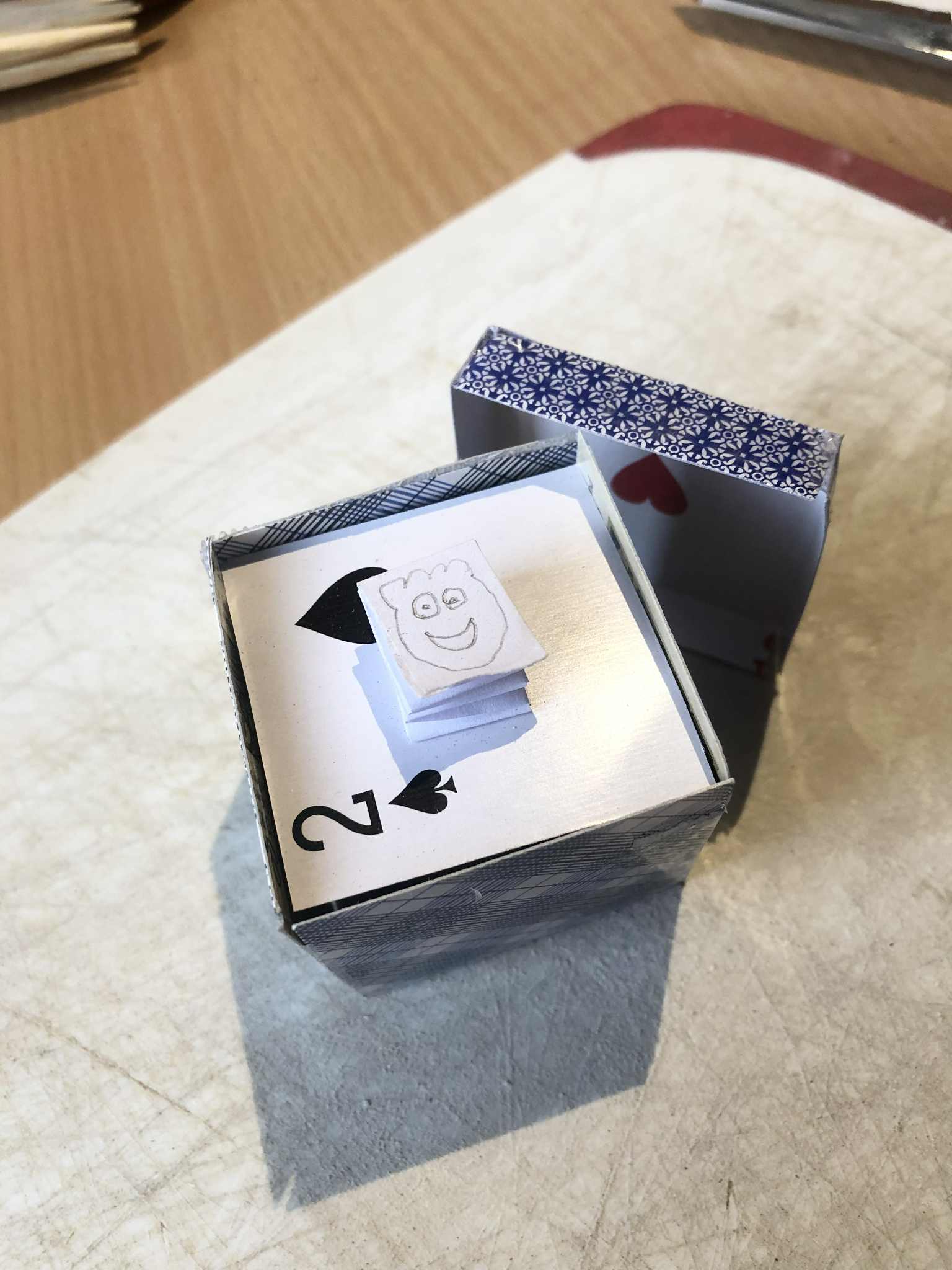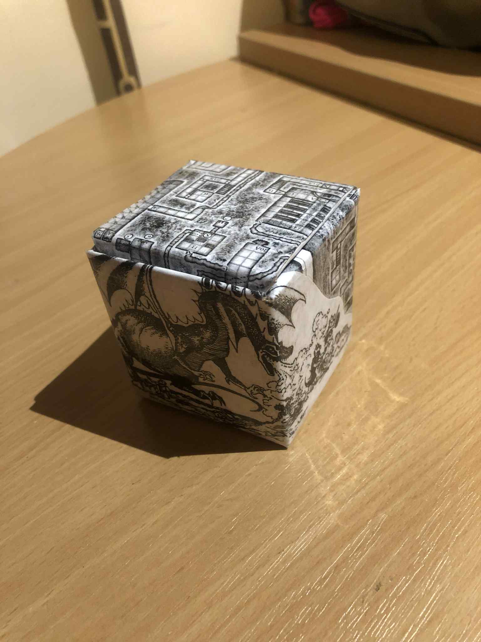 So much like the Efreeti Bottle, this was also not originally going to be made, mainly due to the difficulties of doing so, and it wasn't a "deck" item, but... a printer destined it to be built, so naturally... it had to be. But how, how could I make anything even remotely resembling a Jack-in-the-box??? The answer: You can't. Or rather, I can't. To get it to eject a one of six random selections at the turn of a crank, that is WAY beyond my abilities. But... what I CAN do, if I simplify it down a lot, is make a box that has the six results available to pull from it! So I found a box of bamboo skewers, which would have a long enough base to be able to stick the results to, and I could hack the long stem off to the needed height! Problem, solved. Or rather, concept conceived. I started by just using some scrap cards from the many deck builds to slap together a general idea... a small slot in the middle to hold the... ehhhh, six sticks is *really* small, and not really impressive. Also very rectangular. However, if I double it to twelve, it's more squarish, I can just double each of the results, and it looks a bit more impressive. Ahhh, better. Now, on top of the sticks, since it's supposed to be a Jack-in-the-box, I thought to just put a little clown face at the top of those... y'know those little paper springs that you made as a kid (or maybe like me, still), where you take two paper strips and fold one over the other back and forth over and over to make a spring? Well let's make one of those! It won't spring up much, but it'll be springy! And I can use waterproof paper for the strength factor! I tried plastic strips for a moment, but a) glue wouldn't hold it well, and b) it would be too thick. So waterproof paper it is! And then I had an epiphany! While I can't get a music box inside of there (at least not with my present abilities), what I could do, to at least give a crank *some* use, is put a little jingle bell on the other side, so that when you turn the crank, it will at least make a jingle sound! Yah I know it'll jingle if you shake the thing in general, but it's the principle of the thing. It was either that or glue the crank down and have little text strips beside it saying "pretend you crank this to open it". Having it turn a jingle bell is much better :D We needed to flatten the bell down slightly to fit into there, and even removed half of the cardboard from that side of the inner structure to accomodate it, but it's in there, and it's free-standing away from any surface except the crank it's jb welded to (I dunno, I figure it'll jingle better that way). The crank itself is bent 18 gauge stainless steel wire, with some tiny pieces of like... on the inside of an old broken power inverter, I disassembled it and yanked out some very thin metal plates that were used for electrical contact, trimmed those round, drilled a hole in them, and used those as support on either side of the box side sorta like a bushing. There's also glue in there (I kept cranking it occasionally as it dried) to solidify up the powdered cardboard stuff that this material is in there. So anyway, we made that as strong as we could. Gotta say, it was quite difficult to get that thing through the side to begin with, kinda mangling it through, which is also the reason for all of that, rebuild the mangled cardboard powder at the hole. Anyways, that thing installed, we finished gluing up all the sides, and made a lid for it. Now this brought up its own decisions, since in a regular Jack-in-the-box (and indeed in the DMG image), the side walls should go all the way up, and the lid set into the center of it. But that would require an inner lip, which would shrink the opening (and make it taller), making it more difficult to get your fingers into. So we went with the outer-lip method instead. And with all of that decided, we could begin painting! We started by sanding all of the sides flat, which ended up being to the point that all of the black coating was removed, otherwise it made for weirdly different textures, and hit it with a few layers of primer, sanding between to smooth it all down again (the kinda pressboard powder simply couldn't sand smooth on its own). Since the official art (5e.tools) would be more or less impossible for me to recreate, I decided to go with a more abstract approach, searching for abstract crowd painting (Google image search), and basically did that. Ok, so we've got absract people (with a trippy three bodies one head thing on the lid, just kinda... there wasn't room for three heads so we just tried this, and it works with the creepy vibe in the end. Also heavy impasto for the same vibe), what else is on the official art? Green borders, aight. Actually, clasp first, we came up with what we want to do for that. I'd been rattling around like half a dozen ideas in my head for the lid, do I want to use a pen spring to pop it open (spring is much bigger than I expected), and settled on a simple hook and loop type clasp. We drilled some holes in the appropriate places, added the loops and hooks, and bent them over on the inside (filing partway through the wire to get it to bend at a nice 90 degree angle), and glued those inside the walls. Ok, back to the borders. We created a little corner cover with a pinhole 5mm from either side, and used that to mark a spot around all of the corners (taking into account the lid), and used masking tape to make a straight line between those, and slowly painted all of the borders in. What else we got, vinework in the corners. Let's get some of those going on in there, thank you painting with toothpicks. Flowers, did I want to attempt those red flowers? Let's test making a little stamp out of cardboard. All of the flowers will be more or less identical, but y'know I'm fine with that, theyre simple at best. We needed to blot off the stamp to make it stamp cleanly (making for a cute little blotting paper), and threw a handful of those around the frames, and used