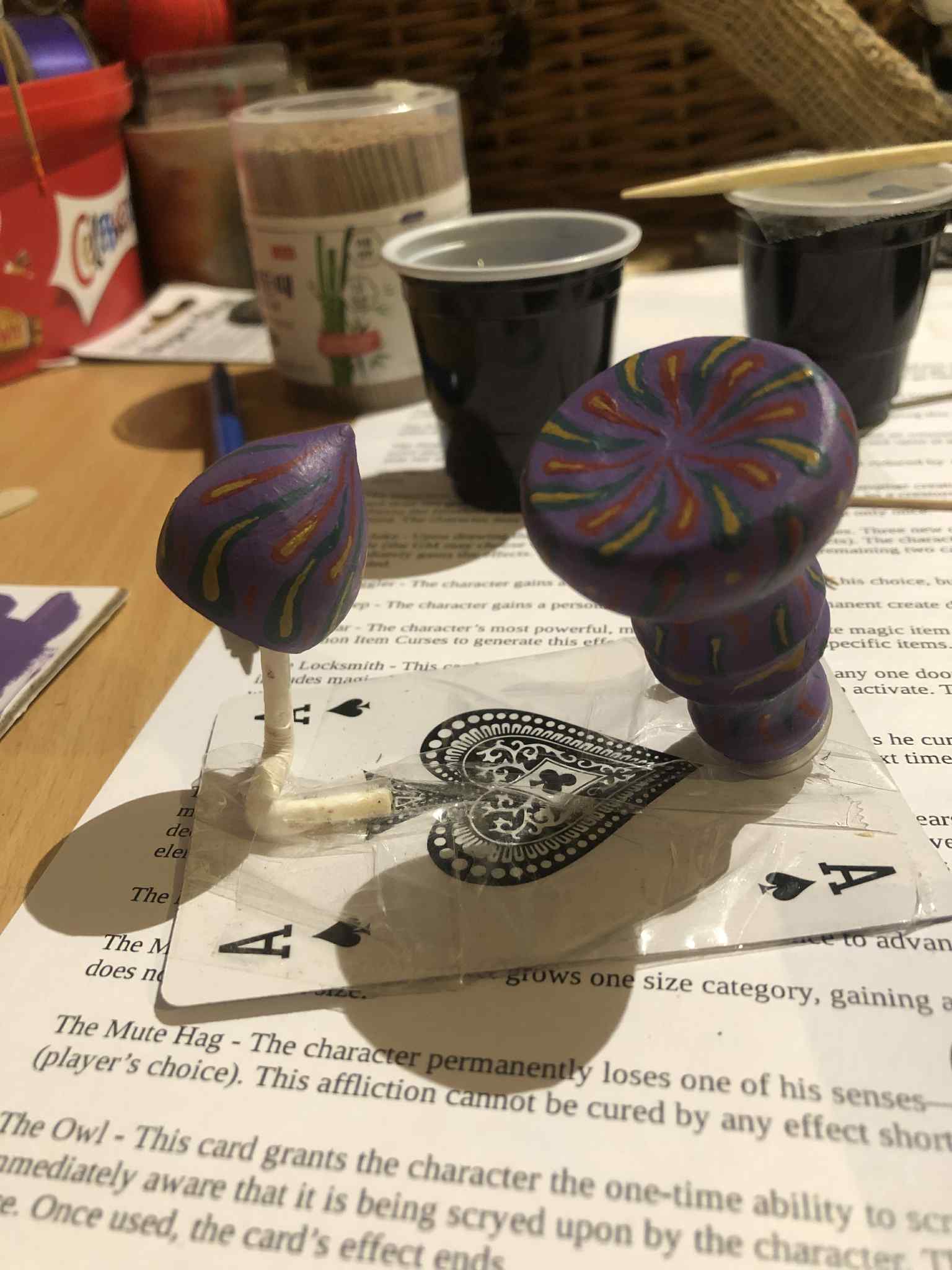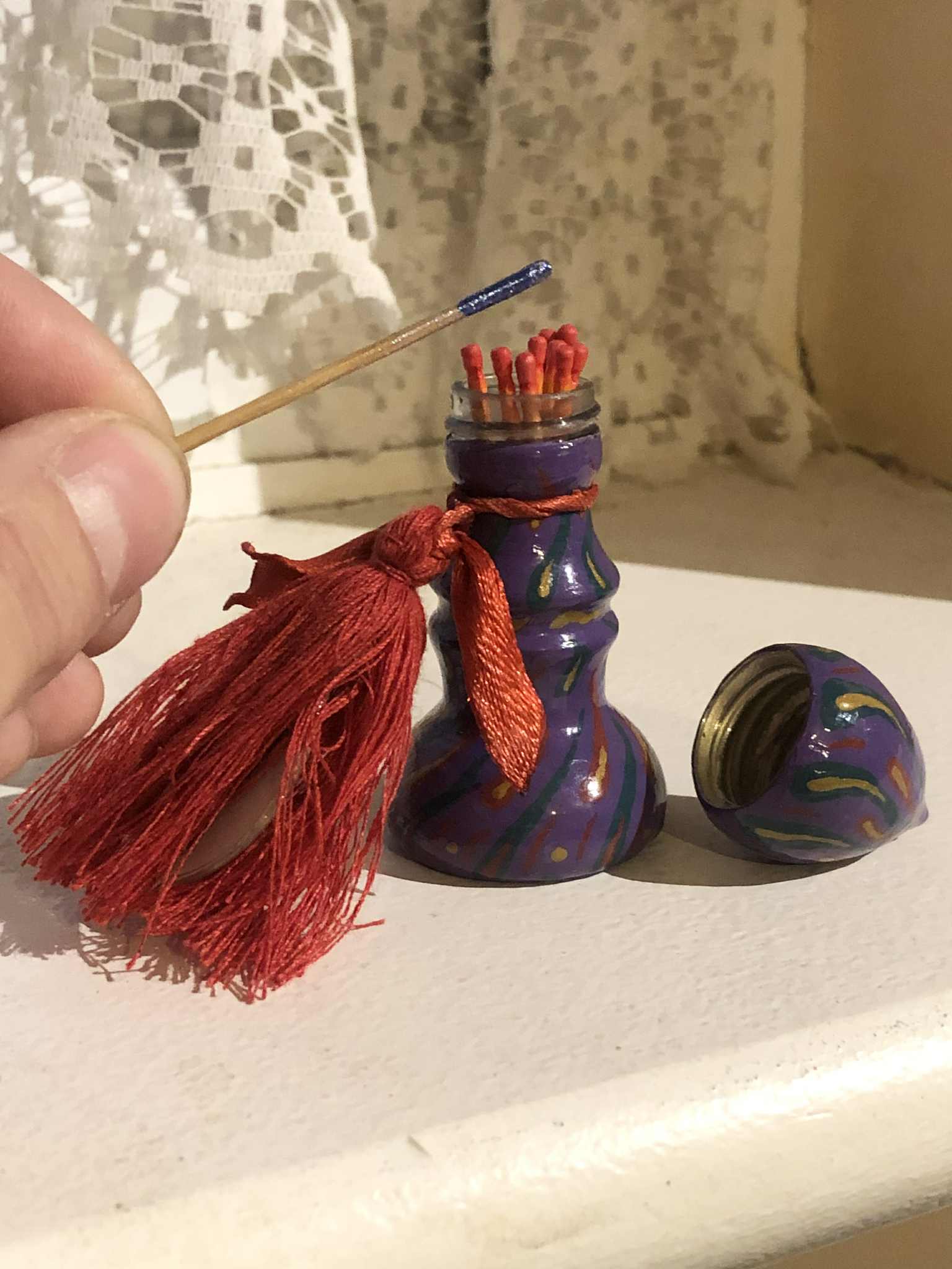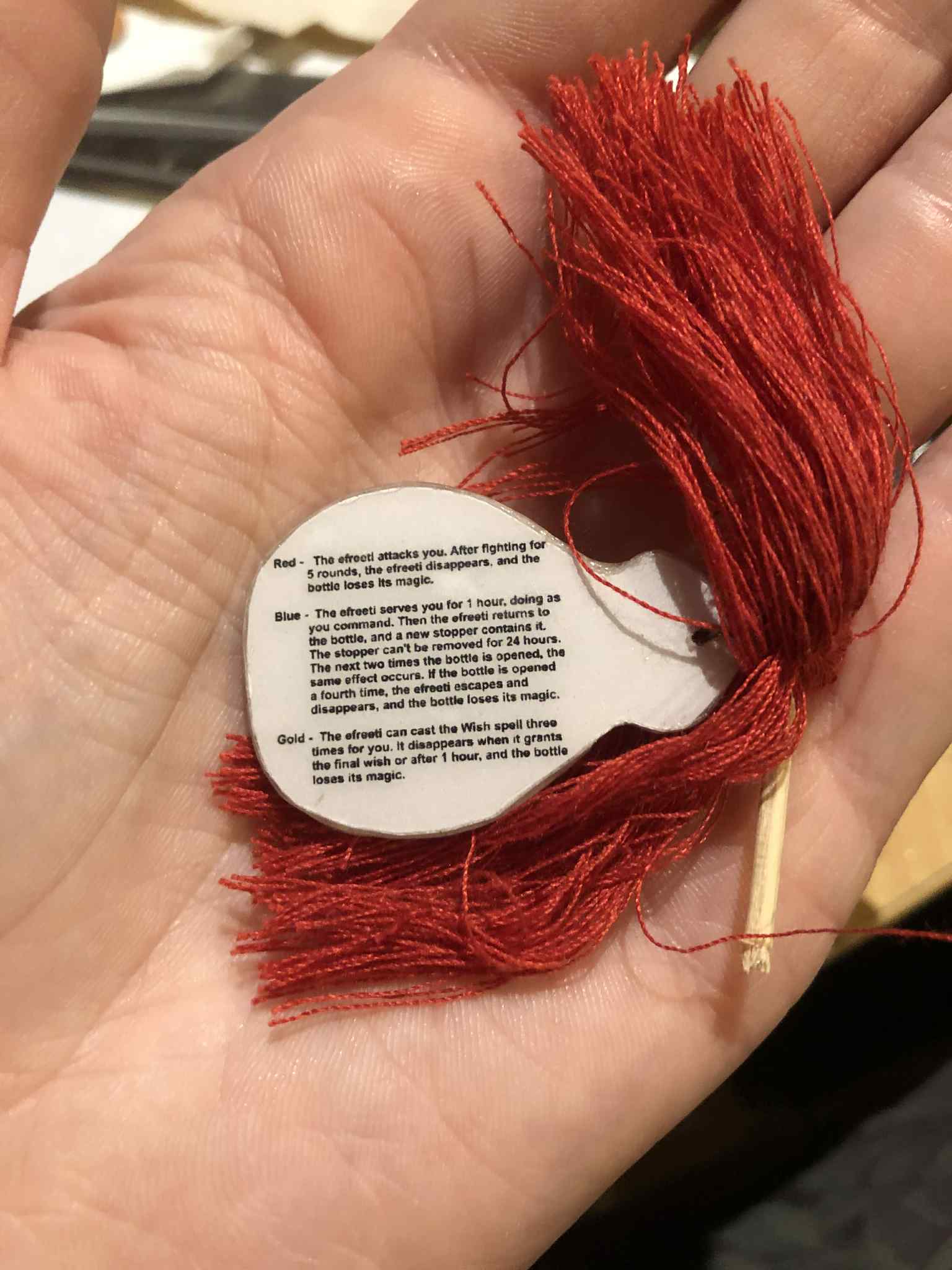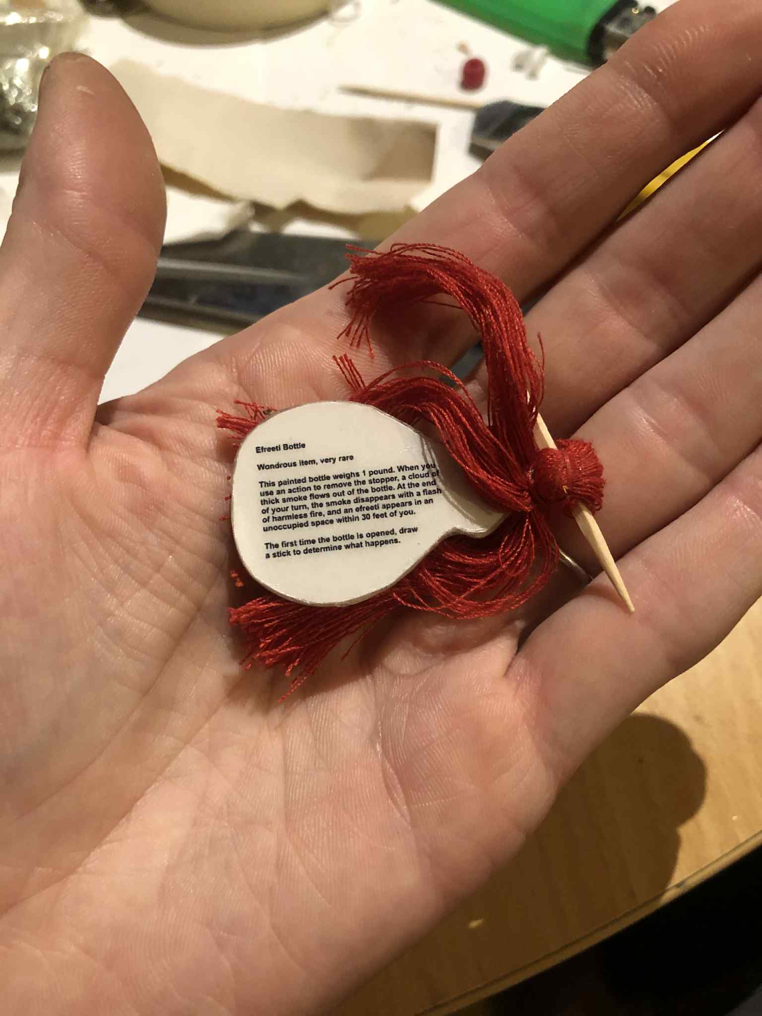 So, originally this item wasn't going to be built. It was listed in the All the Many Things page, with just purely digital images (and still is, it just looks better), but the thing is... when I was making the Menu of Many Things book, on the back inside cover where I listed additional magic items that you can draw from, I... accidentally added the Efreeti Bottle and Cube of Summoning. So now, while I could just reprint the page, I mean... I could also just build the items! I mean... it seems almost sad to have like... *every other item* made, but then be missing these two, so like... it had to happen. It was printed, it was destined. And so, we pondered how to go about doing this. First, we needed a bottle, of course. I tried hunting around craft and hobby shops, even candy containers that might look suitable, but nothing fit the bill. And then I found one of those little mini bottles of ye olde rotgut on the ground, and thought ayyyy, that looks like it'd work! So we scooped that up, and set about hacking it to pieces! And what to draw? Small little sticks, toothpicks! But not cheap wooden ones, those tend to split down the middle, as... countless annoyances while painting with them have told me. Bamboo tho... that grows very straight-grained, is very strong, you should do me well! So we ordered some bamboo toothpicks online (finding them in-store was proving difficult), and set about adjusting the rules to it. So... there's ten possible results, a 1 in 10 chance of three wishes, 1 in 10 chance of it attacking you, and 8 in 10 chance of it helping you for an hour, which you can call upon three times. Also why I didn't make it initially, it's a one-time use item (so to speak), once a stick is drawn, you get the result, and then it becomes a nonmagical bottle. But... the printer has spoken, it must be made! So, as the rules state that there's smoke, then a flash of fire, and then the genie appears, I decided to paint the tops of the toothpicks to look like flame, as much as I could. I didn't make them pointy-topped, I figured that was just asking to get chipped off, but... fire-looking paint. On the bottom, we painted one gold, one red, and the rest blue, so that the instruction sheet that comes attached to the bottle can list the rules as red, blue, and gold. Also, when topcoating these, I used sparkly topcoat for the bottoms of the sticks to give it some magical sparkle ^_^ The bottle! I started by adding JB Weld to the inside of the bottom, to make it smoothly round and not have the plastic injection point dimple in the middle. The width at the very base was also made smaller with JB Weld on the inside, so that the sticks wouldn't be tempted to bend and curve underneath. So on the inside, it's more or less a straight shot down from the opening to the base. It also made the base heavier which is kinda nice, counterweights the lid. So we JB Welded AND crazyglued the bottom to the top (basically whatever I could do to get it smooth), and then to add the two ridges at the center of the stem, I used string also glued into place. I used some painter's tape to mark parallel lines with a file, and glued along those. In the meantime, all of this was kinda happening at the same time, I made the instruction tag somewhat in the shape of a bottle, and then randomly stumbled across a burgundy red tassle laying on the ground at a train station! So hey, I thought that would be a cool addition, kinda hide the tag inside something interesting for having it dangle around the bottle. So we used some 11 pound Spider Wire fishing line to attach the tag inside of the tassle (which also went through the main tassle loop, and wrapped around at the pinch point for added strength and avoid the default wrap there from coming undone. And with the tag waiting, the bottle was fully covered in JB Weld and sanded smooth, looking incredible at this point. It was painted with a primer, and then... since the official art (google image results) has a very intricate, geometically repeating pattern, there was *no chance* I would be able to recreate that, so I took some creative liberties. I gave it a purple base, since that felt "magical", with streaks of teal and burgundy, and smaller streaks or dots of gold usually inside of the other colours. And it came out incredible! Yah it's a bit different from the default, but fully burgundy? Eh, fully teal? Eh, let's do purple with streaks of the other two, and some gold in there. It got a spray of clear gloss enamel to protect the paint from the topcoat (which tends to streak even dried acrylic paint), and once that dried, we gave it two coats of nailpolish topcoat for an extra glossy finish and strength, and then all that was needed for that to dry so we can attach the tag. And how do we attach the tag? I took some red ribbon, soaked it in instant coffee for a week to get it to the colour I wanted (after rinsing and drying), and then twisted it in the loop around the bottle to kinda narrow it down to a thinner strand and square-knotted it into there, and added a drop of crazy glue to the knot to keep it from coming undone (which wasn't even fully necessary because of a thread sewn through the knot shortly). After mucking around a little bit to find the neatest way to attach the tag, we knotted that on too, and then to keep it looking smooth and uniform, used a red thread to sew those two knots together in the middle loop between the tag and the bottle. And with that, our Efreeti Bottle is complete! A tag interestingly hidden inside a tassle,an intricately painted bottle, and a handful of sticks inside for you to draw to see what your result is. Epic :D Finished October 5, 2025 Of course you can open the bottle. (original pre-build draw page retained for style) |