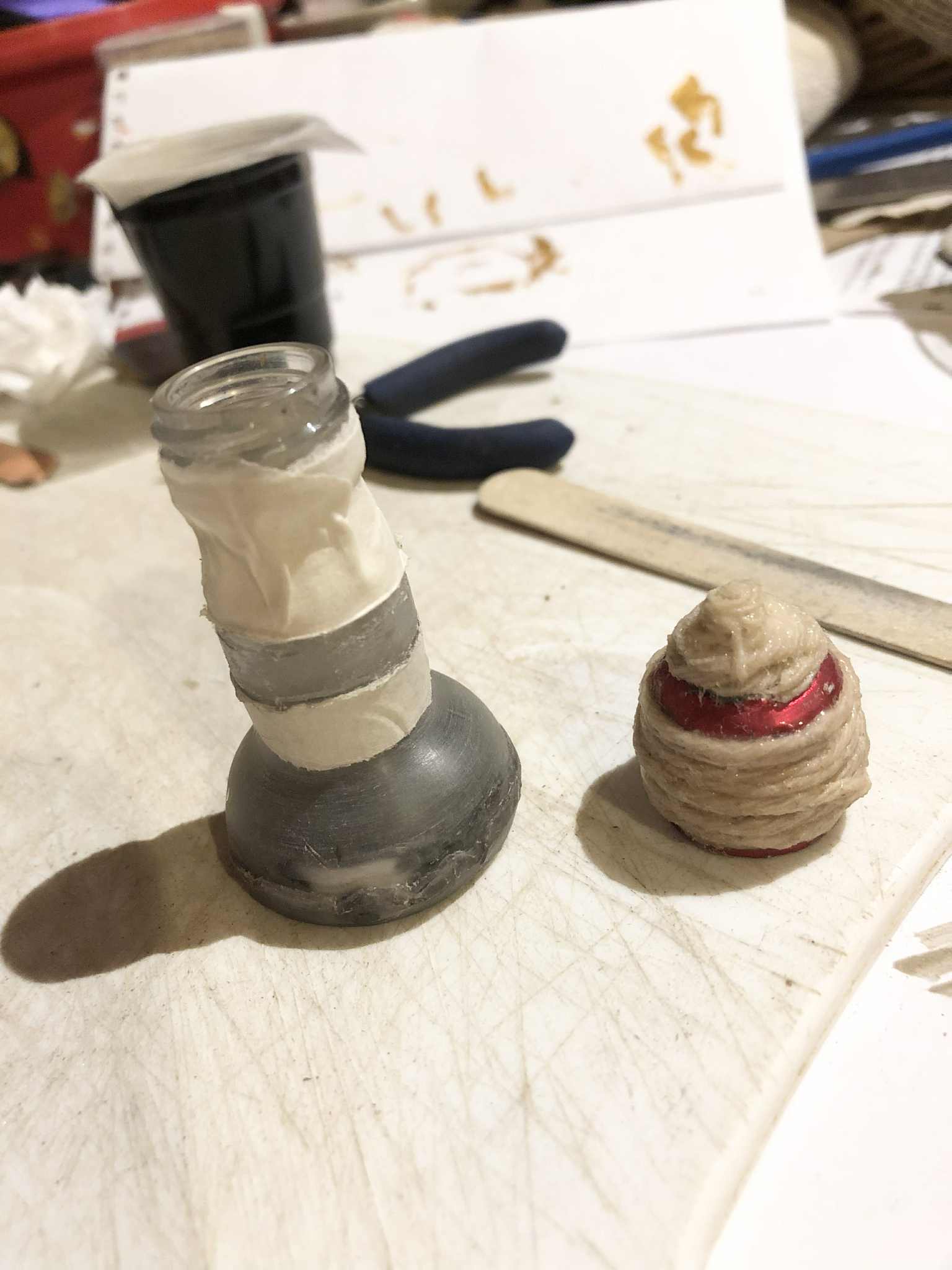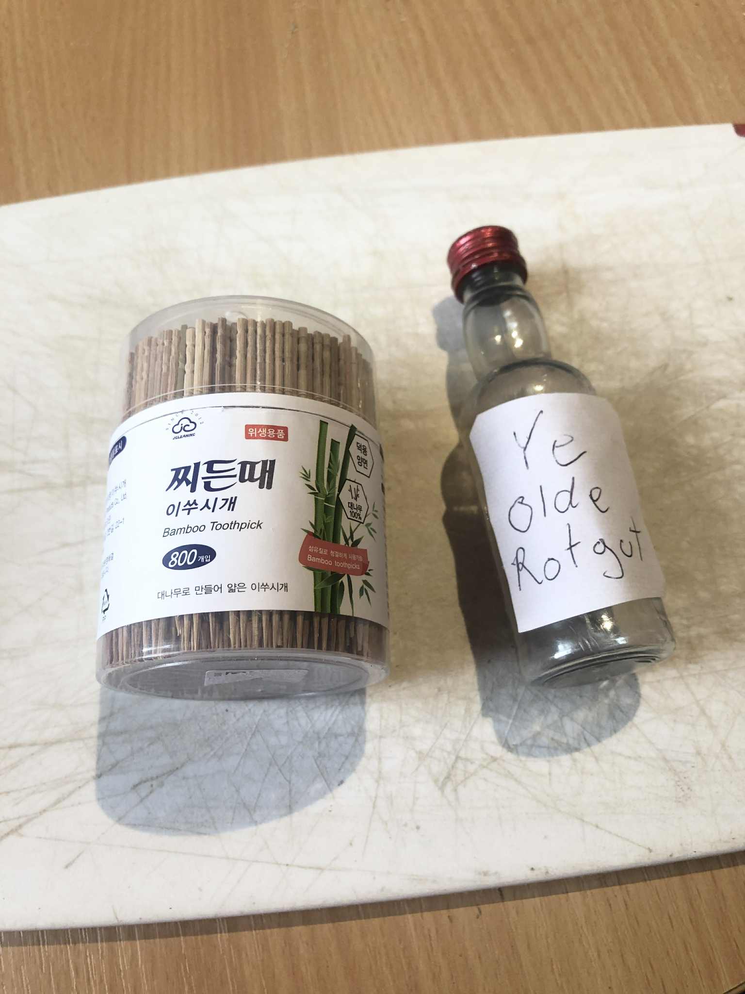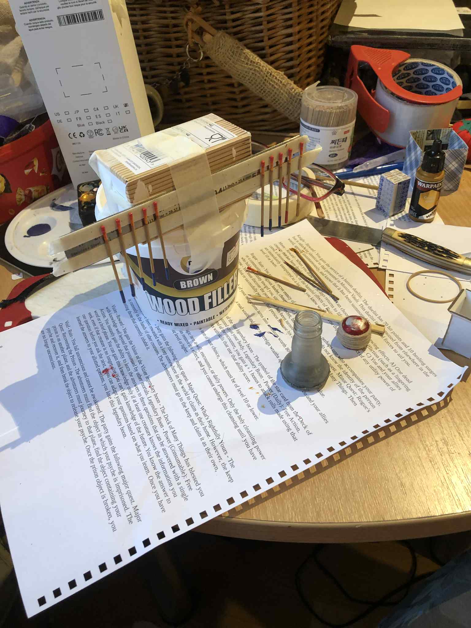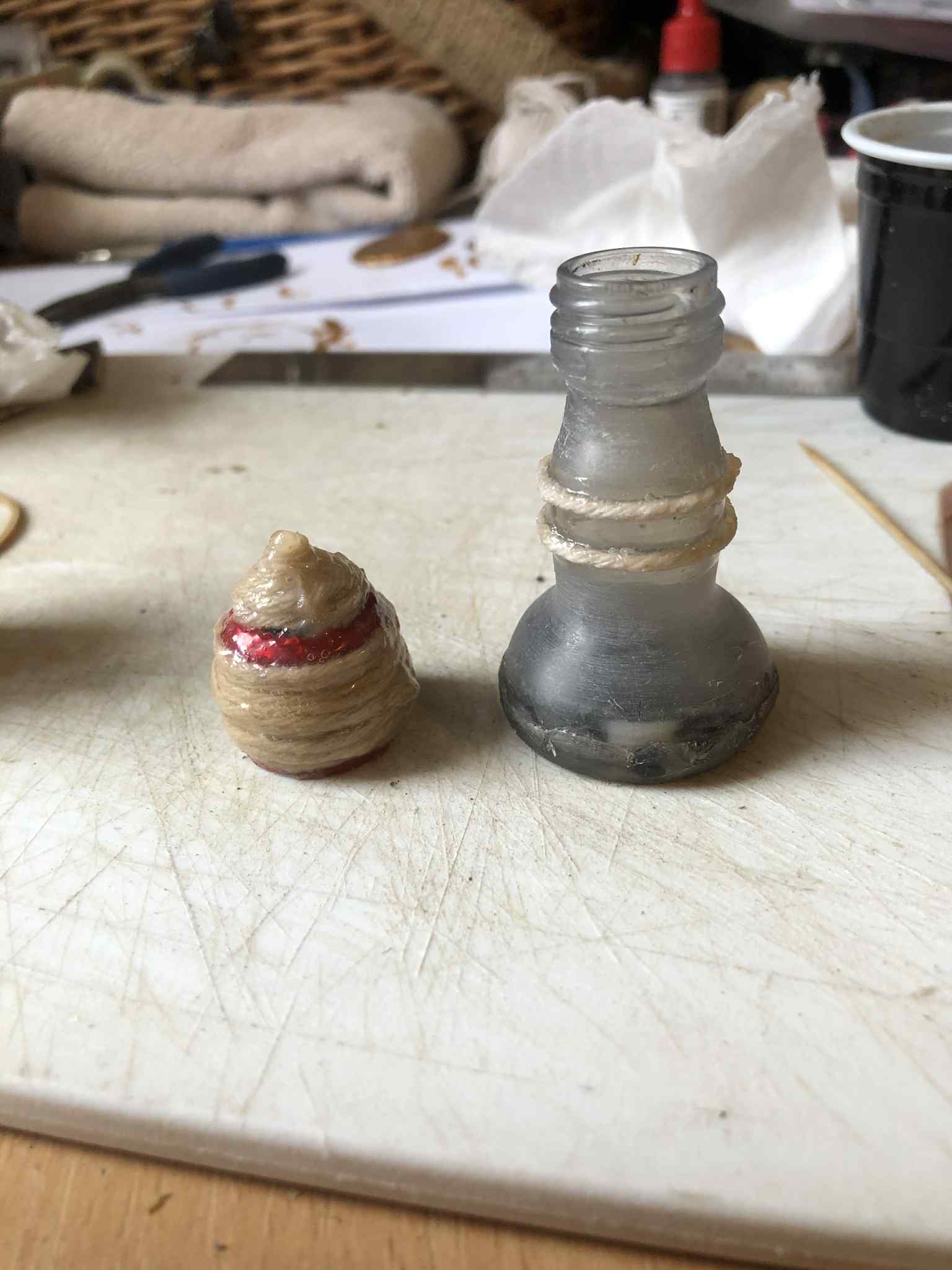 So, originally this item wasn't going to be built. It was listed in the All the Many Things page, with just purely digital images (and still is, it just looks better), but the thing is... when I was making the Menu of Many Things book, on the back inside cover where I listed additional magic items that you can draw from, I... accidentally added the Efreeti Bottle and Cube of Summoning. So now, while I could just reprint the page, I mean... I could also just build the items! I mean... it seems almost sad to have like... *every other item* made, but then be missing these two, so like... it had to happen. It was printed, it was destined. And so, we pondered how to go about doing this. First, we needed a bottle, of course. I tried hunting around craft and hobby shops, even candy containers that might look suitable, but nothing fit the bill. And then I found one of those little mini bottles of ye olde rotgut on the ground, and thought ayyyy, that looks like it'd work! So we scooped that up, and set about hacking it to pieces! And what to draw? Small little sticks, toothpicks! But not cheap wooden ones, those tend to split down the middle, as... countless annoyances while painting with them have told me. Bamboo tho... that grows very straight-grained, is very strong, you should do me well! So we ordered some bamboo toothpicks online (finding them in-store was proving difficult), and set about adjusting the rules to it. So... there's ten possible results, a 1 in 10 chance of three wishes, 1 in 10 chance of it attacking you, and 8 in 10 chance of it helping you for an hour, which you can call upon three times. Also why I didn't make it initially, it's a one-time use item (so to speak), once a stick is drawn, you get the result, and then it becomes a nonmagical bottle. But... the printer has spoken, it must be made! So, as the rules state that there's smoke, then a flash of fire, and then the genie appears, I decided to paint the tops of the toothpicks to look like flame, as much as I could. I didn't make them pointy-topped, I figured that was just asking to get chipped off, but... fire-looking paint. On the bottom, we painted one gold, one red, and the rest blue, so that the instruction sheet that comes attached to the bottle can list the rules as red, blue, and gold. Also, when topcoating these, I used sparkly topcoat for the bottoms of the sticks to give it some magical sparkle ^_^ The bottle! I started by adding JB Weld to the inside of the bottom, to make it smoothly round and not have the plastic injection point dimple in the middle. The width at the very base was also made smaller with JB Weld on the inside, so that the sticks wouldn't be tempted to bend and curve underneath. So on the inside, it's more or less a straight shot down from the opening to the base. It also made the base heavier which is kinda nice, counterweights the lid. So we JB Welded AND crazyglued the bottom to the top (basically whatever I could do to get it smooth), and then to add the two ridges at the center of the stem, I used string also glued into place. I used some painter's tape to mark parallel lines with a file, and glued along those. In the meantime, all of this was kinda happening at the same time, I made the instruction tag somewhat in the shape of a bottle, and then randomly stumbled across a burgundy red tassle laying on the ground at a train station! So hey, I thought that would be a cool addition, kinda hide the tag inside something interesting for having it dangle around the bottle. So we used some 11 pound Spider Wire fishing line to attach the tag inside of the tassle (which also went through the main tassle loop, and wrapped around at the pinch point for added strength and avoid the default wrap there from coming undone. And with the tag waiting, the bottle was fully covered in JB Weld and sanded smooth, looking incredible at this point. It was painted with a primer, and then... since the official art (google image results) has a very intricate, geometically repeating pattern, there was *no chance* I would be able to recreate that, so I took some creative liberties. I gave it a purple base, since that felt "magical", with streaks of teal and burgundy, and smaller streaks or dots of gold usually inside of the other colours. And it came out incredible! Yah it's a bit different from the default, but fully burgundy? Eh, fully teal? Eh, let's do purple with streaks of the other two, and some gold in there. It got a spray of clear gloss enamel to protect the paint from the topcoat (which tends to streak even dried acrylic paint), and once that dried, we gave it two coats of nailpolish topcoat for an extra glossy finish and strength, and then all that was needed for that to dry so we can attach the tag. And how do we attach the tag? I took some red ribbon, soaked it in instant coffee for a week to get it to the colour I wanted (after rinsing and drying), and then twisted it in the loop around the bottle to kinda narrow it down to a thinner strand and square-knotted it into there, and added a drop of crazy glue to the knot to keep it from coming undone (which wasn't even fully necessary because of a thread sewn through the knot shortly). After mucking around a little bit to find the neatest way to attach the tag, we knotted that on too, and then to keep it looking smooth and uniform, used a red thread to sew those two knots together in the middle loop between the tag and the bottle. And with that, our Efreeti Bottle is complete! A tag interestingly hidden inside a tassle,an intricately painted bottle, and a handful of sticks inside for you to draw to see what your result is. Epic :D Finished October 5, 2025 Of course you can open the bottle. (original pre-build draw page retained for style) |