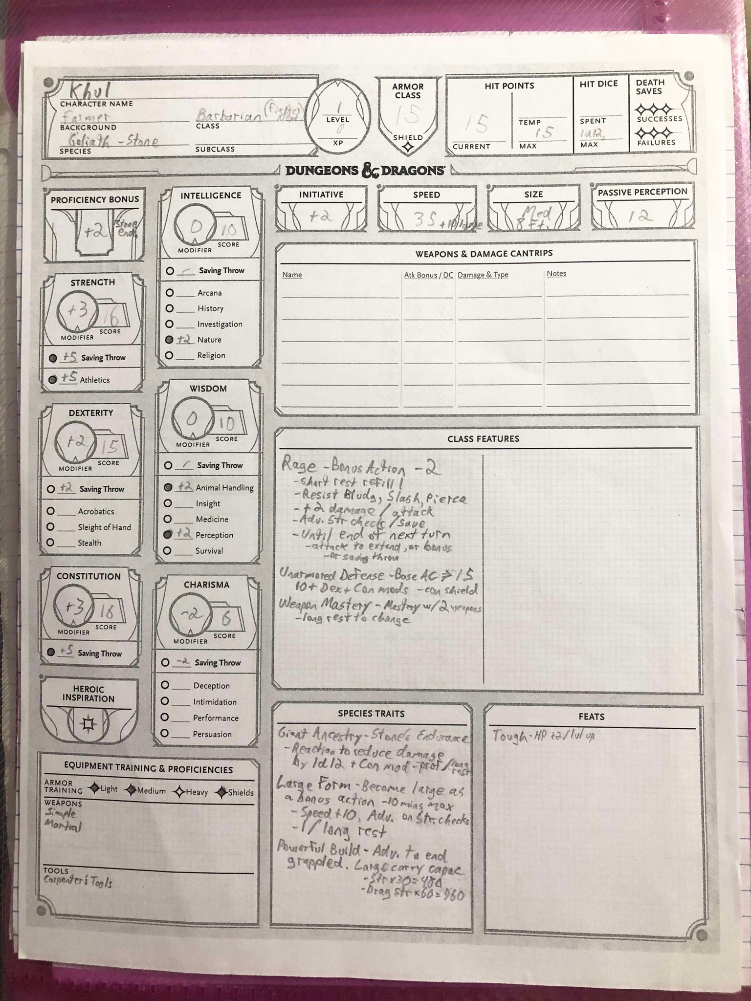 Aw yeah, we're going in that direction! Always loved playing the gruff, rarely-speaks barbarian type (see Sushi). I guess you'd have to have been there, she was just a big ol' axe-swinging bushi, and Khul is just a big ol' sword-swinging fighter. But like, I picture them as swinging it more like an axe, just over-hand brutal swipes, no finesse, no style, just like Guts from Berserk (who inspired Khul, whos name incidentally implies 'cull', as in to cull the herd of evil) swinging a sword as hard as you can. Yah, surprisingly not sticking with barbarian. Just started there for rage, and is going full fighter after that. They wear heavy armor and swing a sword, it's more just a brutal fighter style with some raging involved.