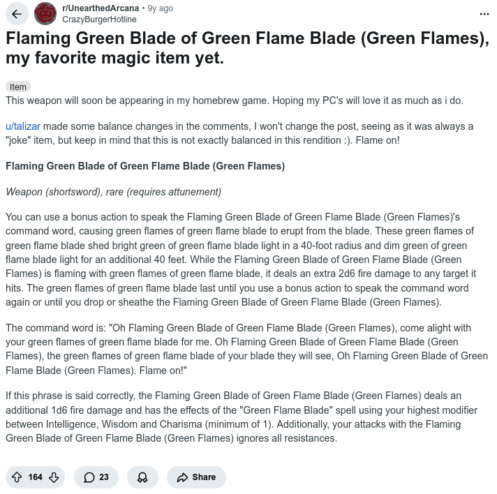 This item was made for Kraid. It was almost destined to be. Y'see, when I made that strip two strips ago (DIBS!), I just wanted a glowing sword sitting there for Kraid to grab, and picked green for pretty much... "looks evil" lol. After THAT, I looked around online for dnd swords that glow green. Which is apparently very few. Or none even. I mean, there's that green flame blade cantrip spell, but that's not the object itself. And then this Reddit post (thank you CrazyBurgerHotline!) came up in the results (.png format in case that link changes). Yeah... yeah, that'll do. Tho, like talizar mentioned in the post, I'm making some changes to it too. Homebrewed is homebrewed yo!