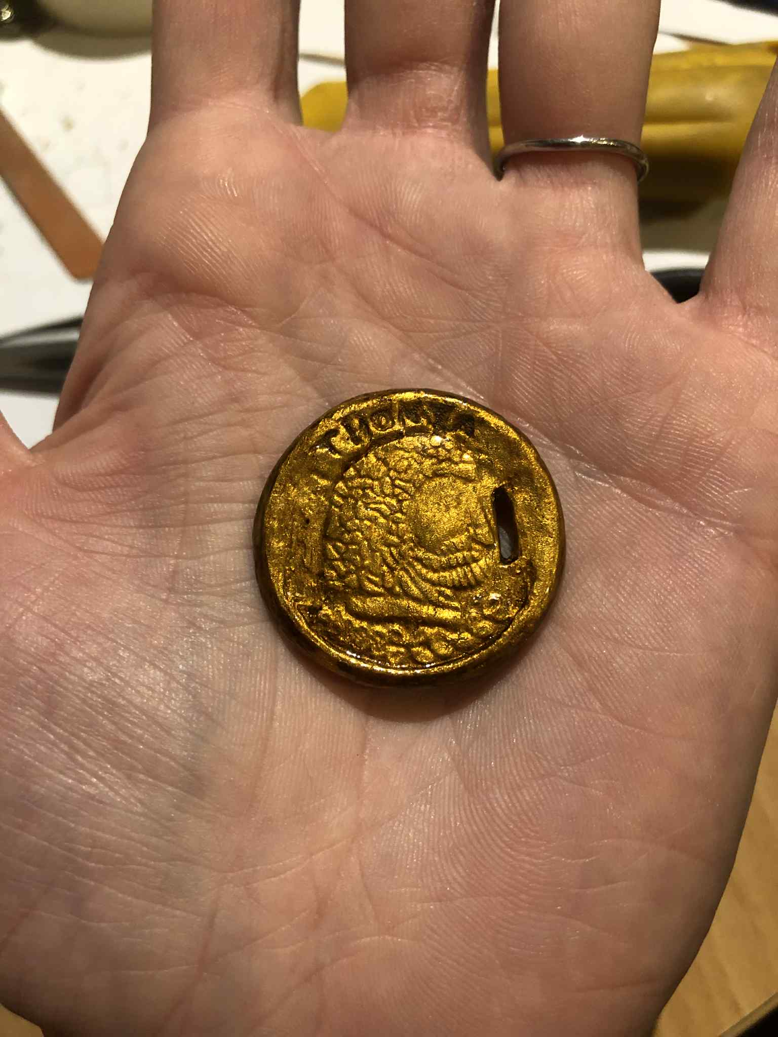 Oh wow, this has been taking me FAR longer than I expected. I figured like... a one-weekend build? Sure, let's knock it out, call it a day, and move on to other things. Nnnnnope, it turns out this was going to take weekend after weekend, waiting for accessories towards the end... this ended up being a bit of a long slog. First up, I needed to make another copy of all of the many things decks (see the bookbinding page for that book), which in itself took an unexpectedly long time, since ther eis an unexpectedly large number of them lol. I also decided to make a separate deck for the 13 card and 22 card versions that have those options, to make it easier to draw from the respective decks without needing to sort through individual cards. On a related note, the wonderful people at Wizards of the Coast created a magic item that uses the remainder of a deck of playing cards, the Deck of Miscellany, which conveniently gave me a whole pile of those to be able to sell as well! Now on to the sleeve. Sleeves? Pocketsheet. This thing! We had spare purple fabric from the merchant bag, and black fabric from some scrap cloth laying around. I began by making long strips of the purple fabric, wrapping around the edges to prevent fraying, with a triple-layer of itself in a strip near the center for a buttonhole to add a pull ribbon to be able to pop each deck up by tugging on the ribbon, for easy selection and added bling (see later). It seems that there are two "standard" card sizes, one about 3mm wider than the other, so for each we made the pocket able to fit the widest standard size, as each of these will be for sale, and be replaced after each sale. Also taking into account, I needed to sew each pocket size to account for the different thicknesses of decks, since there are vastly different sizes ranging from the 11 card Deck of Chance to the 78 card Tarot of Many Things. We also added some added slack to each with a stack of about 10 cards to avoid the pockets being sewn too tight to slide easily. Once I had all of these horozontal purple strips added, after much, much measuring and chalk lines, I created a bottom to each of the pockets with with a wide black ribbon, since the sides of these were all already folded over to not fray, and were of course sized to each deck as needed. Since all of this made for 17 needed pockets, I did three rows of six to give me 18 pockets, the last of which can hold dice or be used for expansion should another deck show up in the future. On that note, I can always combine the 13 and 22 card decks for those respective items into the same pocket should I need further expansion on top of that. Or I suppose add a column of three to the side, or another row underneath, y'know there's plenty of options. In either case, this will do me for a while. With the pockets now all created, I needed to add the pull ribbons to each pocket. Now, for this I pondered for a while, what kind of decoration could I add to each ribbon to pull on, to add the aformentioned bling. I optioned to myself buttons (meh), kinda little woven loops of woody vine (cool, but potentially breakable once they dry out), and then I thought... coins! Like the obligatory copper, silver, and gold coins! Now, I'd first pondered just getting cheap fake-treasure plastic coins that look like treasure coins, and painting each in the respective colours, but couldn't find any in person in-store. So I thought, since I need to order online for this anyway, I may as well get 3d prints for the canon shapes for the D&D coins! Then I can have alternating copper, silver, and gold coins, with one platinum at the very end! AND! AND, I could still take one of those plastic treasure coins (I ordered some of those too for this specifically), and make a Thonian gold coin!!! This calls back to Raven's epic quest (YouTube playlist), specifically Temple of the Frog (YouTube video), so we took one of those plastic coins, added a bit of JB Weld around the rim both for strength, and as well to be able to write into the wet epoxy the needed text, Uther Once And Always, and just the empire name Thonia on the back, since that side isn't described. By chance the plastic treasure coins that we found did have the profile of a bearded man, as described of the coin, and so after the JB Weld modification, we painted it gold, and while the text isn't as clean as an actual stamped coin, I'm going to canonically chalk it up to the technology to make them 4000 years ago wasn't as tight as it is today, let's go with that. Not that anyone will really see it, since it'll be behind the shop table, and will only really be seen glanced at a sharp angle as people walk past my booth, so it's just flavour for flavour's sake really. But, a Thonian gold coin! And then, the 3d printed coins arrived! And there was a... minor problem, comparing it to the D&D coins (ForgottenRealms Fandom). Now, they were advertised as this colour (which I initially didn't even notice), but maybe they did that to avoid issues? I dunno, but I was painting them anyway. So we turned the silver squares bronze, the copper triangles silver (and put a hole in them), the platinum hourglasses gold (with that added circular feature trimmed off), and... well, I don't want to just paint a copper piece platinum. So, we decided to go with the Waterdeep Harbor Moon (ForgottenRealms Fandom), since Raven resides in Waterdeep. Though, smaller, to fit on the cardsleeve. Also, I initially made it... not crescenty enough, so we took some of the initial trimmings (it's made out of like... 6 layers of wooden veneer left over from the Box of Many Things), added a few metal pegs from a safety pin to firmly connect these added... crescent corners we'll call them, and readjusted the shape that way. I carved the faces of the harbor moon as best I could to the official art, though quite scraggly given I have more larger size carving tools, and the softwood veneer wanting to splinter off if I tried anything smal