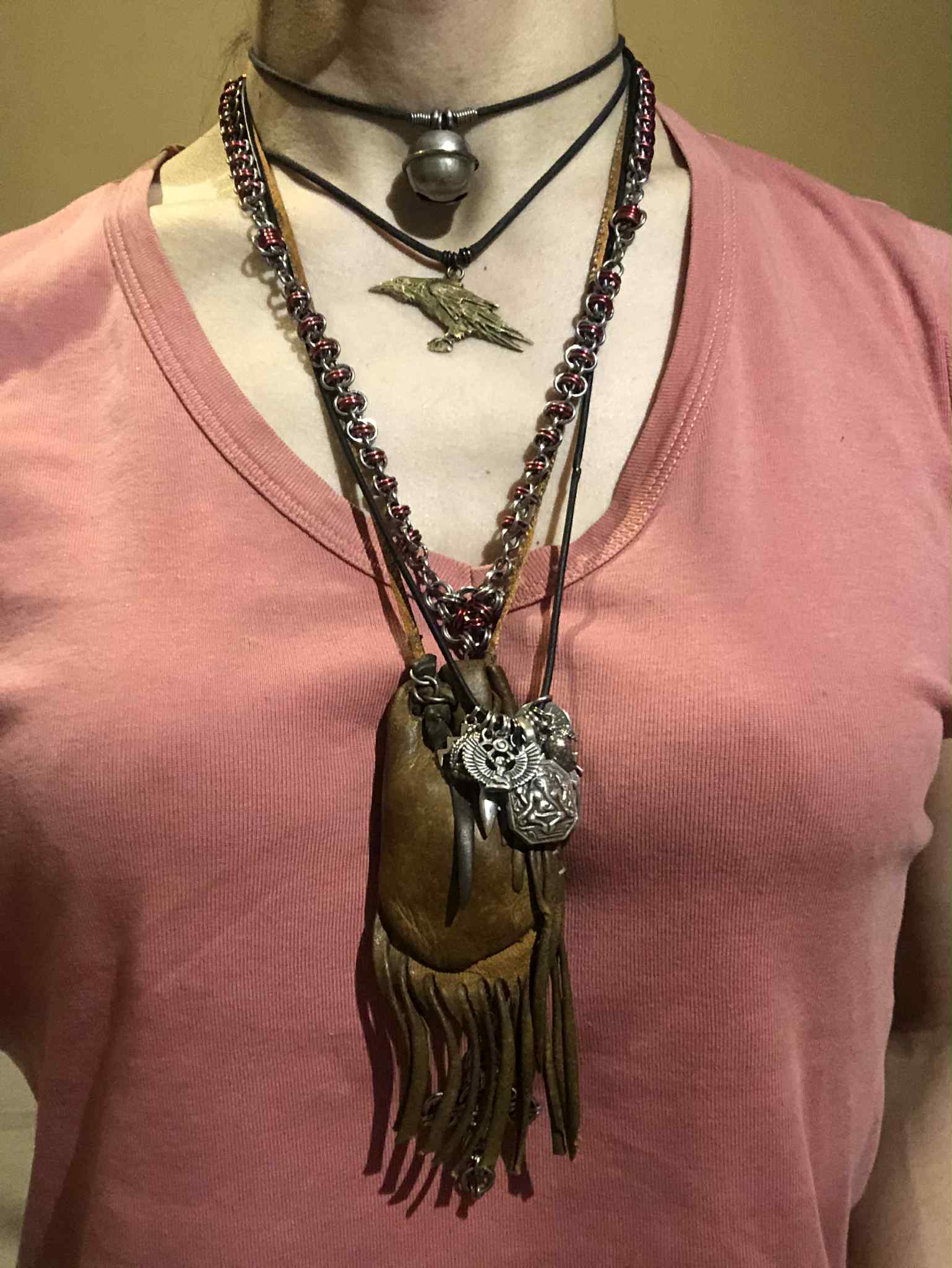 And another update to the Medicine bag, it needed a trim. The strands were starting to get caught on things, in zippers, and generally were so long that they were beginning to develop a curve from simply being too long to lay straight generally anywhere they were set down. On top of that, several of the strands were starting to break off at midpoint from all of this. So, with the advice of the Spiritual Ancestors, we decided that it was time to trim the fringes to clean up the appearance. And so, picking a length that looked appropriate and nice, we trimmed all of the strands, gave them a gentle curve overall, and gave each of the strands a slanted point to clean up the tips a bit. You can see how much was trimmed off here, and it looks much nicer now, cleaner, almost like new again, but with the wonderful patina that it's developed over the years ^_^ Trimmed January 31, 2026 |