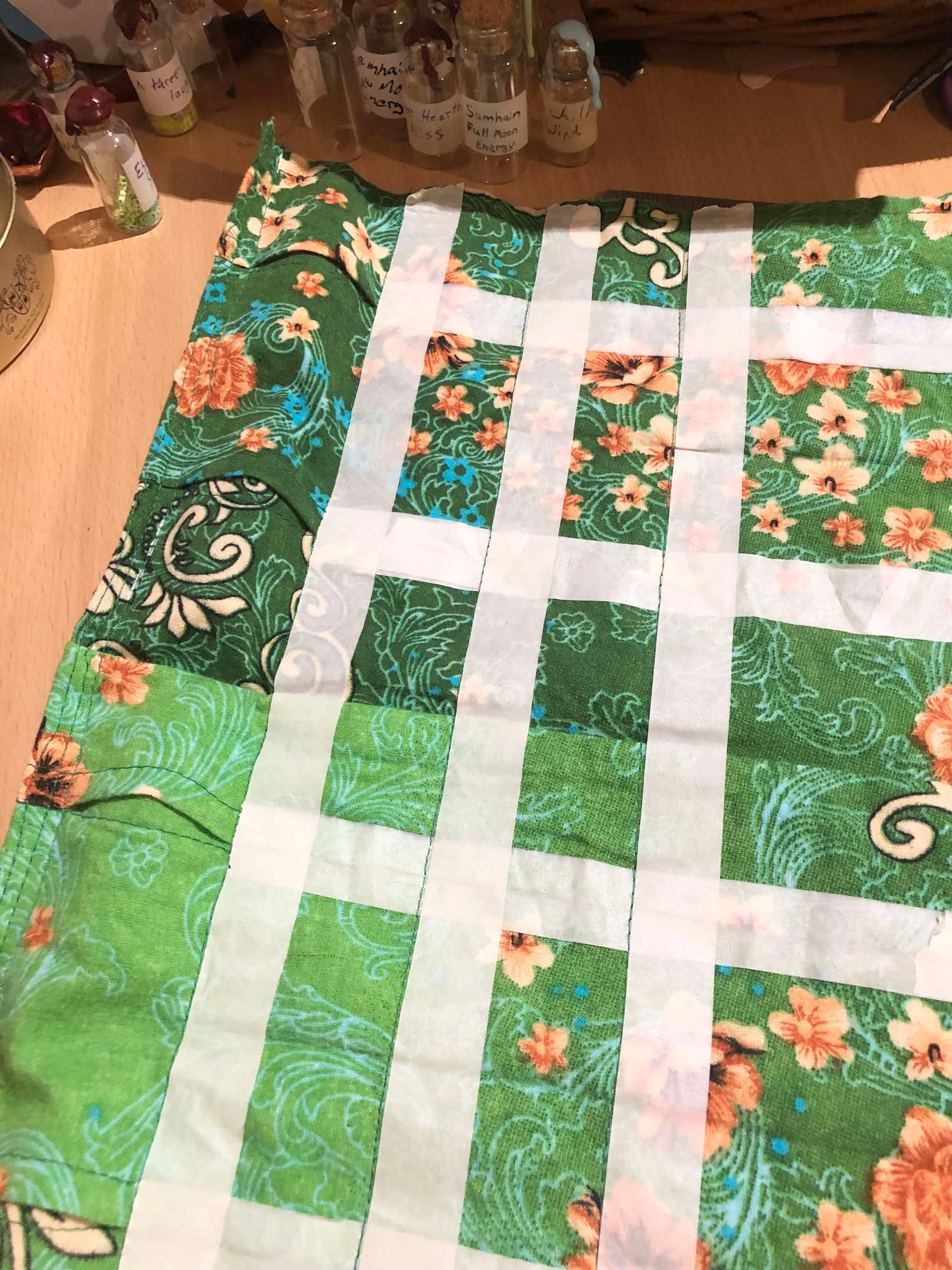 Now, I had a large sheet of this patterened green fabric that I'd oh-so-fortuitously found in a dumpster years ago, and had been holding onto (after washing) ever since. Now was its time! With the merchant bag made, another (several) portions of it went into here. It was an interesting pattern, it was a nice grass-green type colour, it would look incredible hanging up or on a table! Too patterned to use as a tablecloth for the shop, it would work perfect for a smaller-item display! And so we set out. I'd quickly ditched the idea of making like... 50 small rectangles and sewing those all on individually, and my brain quickly came up with a way of using folds in the fabric to create the pockets from a single sheet. We made a seam about a centimeter long, with enough slack at the top to cover up the "back" of the fabric when this was folded forwards to make the lip of the pocket, and, after some testing, made a second seam exactly 15 centimeters end-to-end below that, which when folded up and under the lip, the two seams overlapping, would nicely hold my typical larger potion bottle, with some extra room for wax sealing and a general not-too-tight fit. Some more testing (which would later become a three-bottle holder, and a single-bottle holder as well, because it was there, for my pocket-merchant-bag), we found that having the sides of the pocket 4.5cm wide would fit it just nicely as well. And so a plan to go full-scale was made. Pulling out a larger section of the fabric, we made a loooong stretch of one row of the opening seams, and entirely with tape, held all the folds in place so that the eventual 4.5cm vertical lines would hold everything together. After making a second row of pockets with tape, I'd decided that, since the second row was measured off of the first row's tape lines (from the fold in the fabric under the tape, not the tape itself), I didn't want to make a third row of pockets based on the measure off of a tape line, based on the measure off a tape line, too much asking for inaccuracy there. So since this was a loooong stretch across, we lopped it in half, and seamed the two double-rows of pockets together in the middle! I generally guessed at where to make this seam so that all of the pockets would be equidistant from eachother vertically, and by luck and happiness, it was essentially perfect! We went across that seam like twice, with another line of zig-zag stitch for added measure (with lots of folding and such to keep the frayed end of the fabric tucked inside it all), and we now had a sheet about 30 inches across, and four rows of pockets tall. A nice size, not too large, easy to handle, won't roll too big, good good. Also it would turn out, holds 60 bottles (64 pockets, -4 for double-width pockets)! So that's phenomenal. I technically already have slightly more than 60 as-is, but that would be well enough to bring to any faire shop, picking and choosing which to take with me and such. Also, I had several other odd-sized bottles and containers, which we would figure out later. For now though, with a sheet of fabric that has just a few sewn seams and a crapton of tape, we were ready to put this thing together fully! In come the vertical lines! After the first 3 or so, I removed the tape from those specifically to bottle-test them, and they fit just as perfectly as with the sample test, perfect! On the to the full thing! I used more tape still to mark out the vertical lines one at a time, adding the tape line to follow, sewing right on the edge of it, measuring another 4.5cm, tape, sew, measure, tape, sew, all the way across. For the length of fabric that I had, it turned out to be 16 rows of pockets. I added a seam to the sides, which props to the sewing machine, it was able to handle going through the like... 10 layers of fabric in the folded portions, though for the REALLY thick part right in the middle, I turned the sewing machine by hand to slowly punch through the massive block of fabric right there. Also to add, I periodically used a carpenter's square to make sure the vertical lines were all going 90 degrees from the top edge, adding a millimeter as needed to keep them all perfectly vertical. I'm sure everything being held in place by tape also helped with this. Fun fact, it was kinda fun to remove all this tape at the end, since sewing through it kinda perforated the tape, making a fun 'prrrrt' kinda tear every time I pulled off a small section of tape. Took a bit, and in the crazy middle seam portion some bits of tape are still stuck between the zig-zag part of the thread, which I'm not really concerned about since it's on the back, and it would be brutal to try to remove lol. Might come off after a washing or two, if/when it needs that over time. After the fun de-taping process, we doubled up the vertical lines for added strength, and made the straps. Those were attached with good ol' high-strength polyethylene fishing line for added strength as well, and a small loop was added in the back to loop the straps through when it's open to keep them out of sight. Grommets were added to display it when it's open, and my signature was added in a hidden little spot like usual, behind and underneath one of the pockets. And then, as an added little bonus right at the end, there was this one strange spot that had a frayed hole from what looks like friction, possibly from the manufacturing process or something, so I took the opportunity to add a little embroidered potion bottle overtop of it for an added pop to catch the eye, which came out with an incredible swoop feel to the linework. Epic. And with that, after 20 someodd hours over several days, the potion bottle holder scroll was complete! Completed March 19, 2025 Minor edit not worth taking all new photos for: I moved that loop on the back one slot to the side, since when it's full and rolled up, this will make it grabbable as a carry loop of sorts, also the tie straps will have a bit more slack to go through ther
