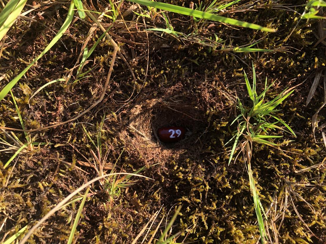 A bean labelled number 36 sitting inside of a hole in the soil, surrounded by grasses and moss.